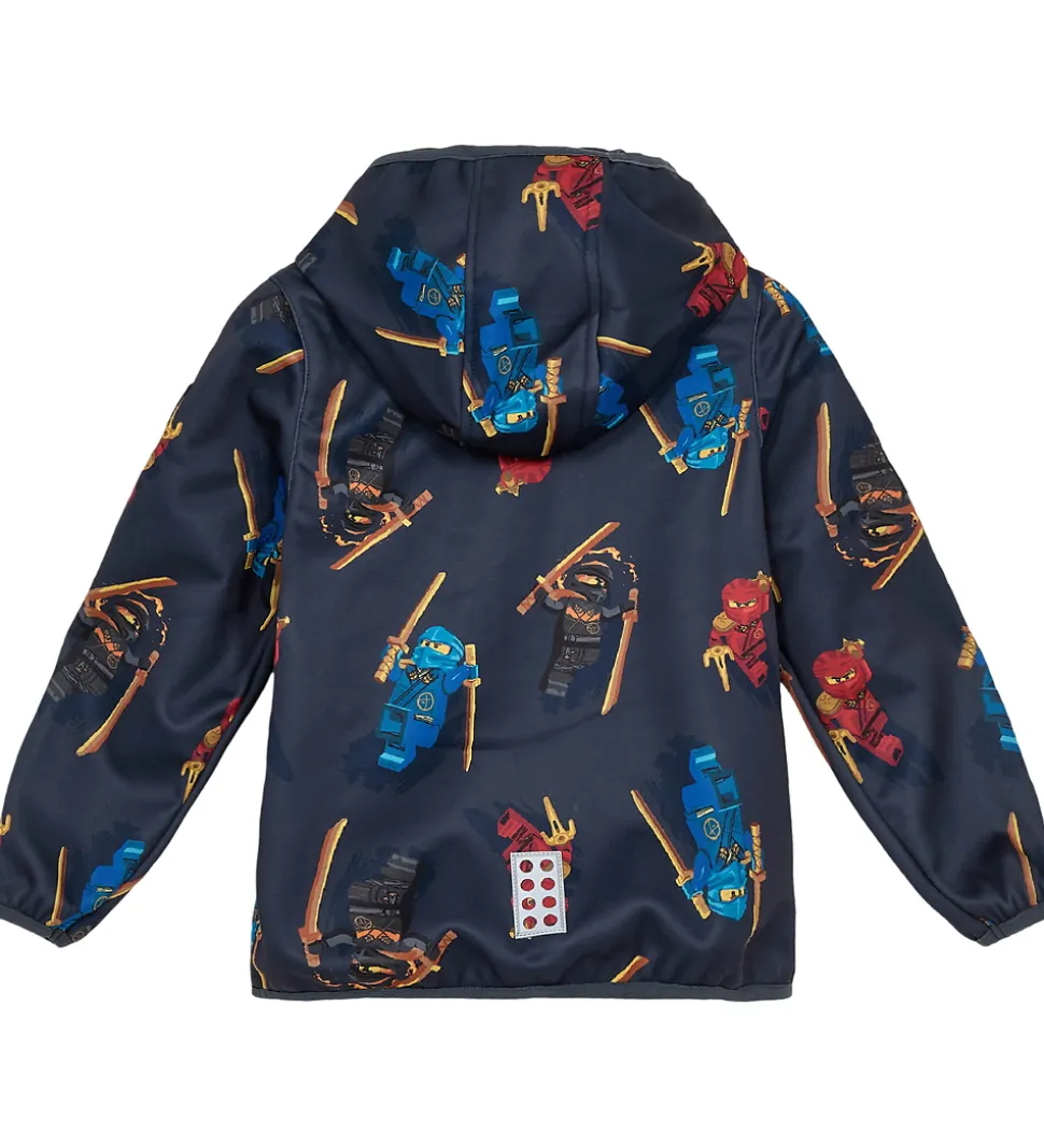 LEGO® Ninjago softshelljakken har en aftagelig hætte, som sidder fast med skjulte trykknapper, og den har smalle, elastiske kanter.
