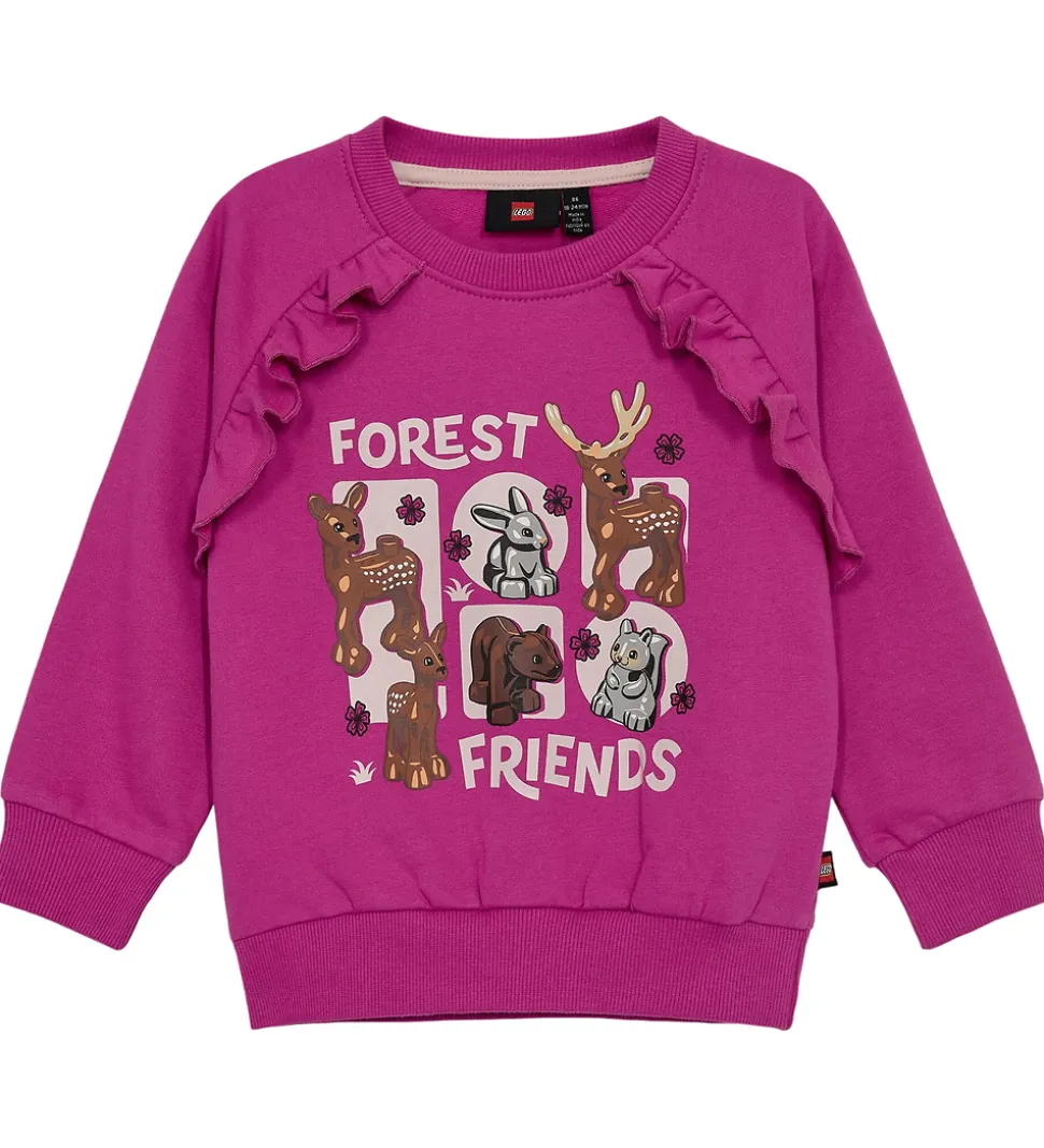Charmerende LEGO® Wear Duplo sweatshirt i pink med et sødt print fortil af skovens dyr omgivet af blomster og teksten “Forest Friends”. Sweatshirten er med blød, børstet bomuld indvendigt.