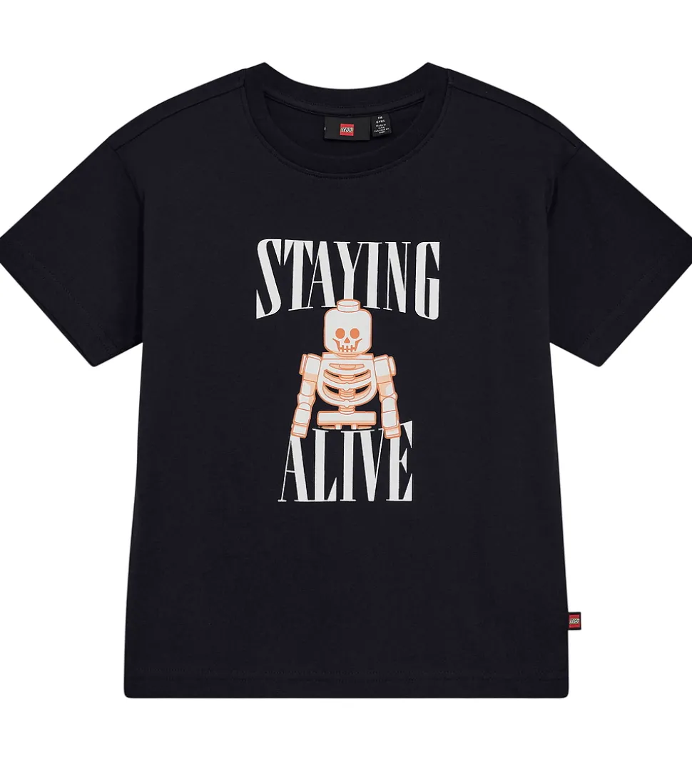Sej LEGO® Wear t-shirt i sort med et iøjnefaldende print i hvid og orange, der viser en LEGO® figur som skelet omgivet af teksten “STAYING ALIVE”. Kombinationen af motivet og den store, tydelige skrifttype giver t-shirten et unikt udtryk.