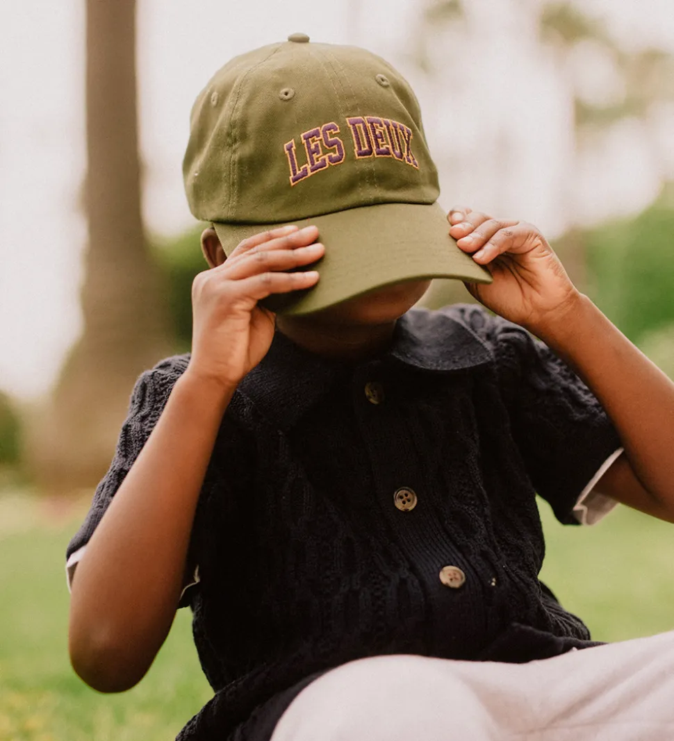 Lækker Les Deux kasket i mørkegrøn, og fortil står der “Les Deux” broderet i lilla med gule kanter.