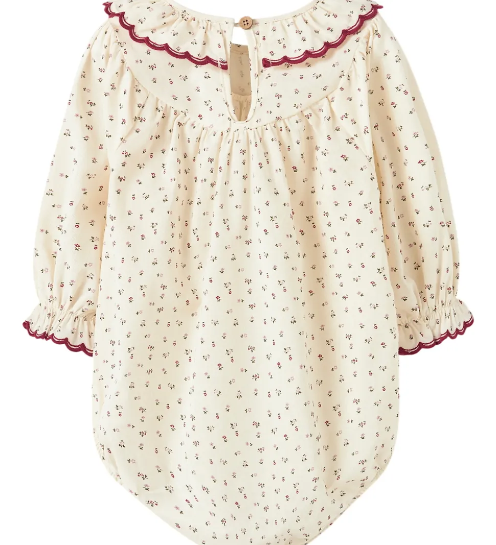 Charmerende Lil’ Atelier body med lange ærmer i en lys råhvid nuance. Bodyens design har et fint, småblomstret mønster og delikate, bølgede kanter i kontrastfarver ved halsen og ærmerne. Den runde halsudskæring bidrager til et klassisk udtryk.