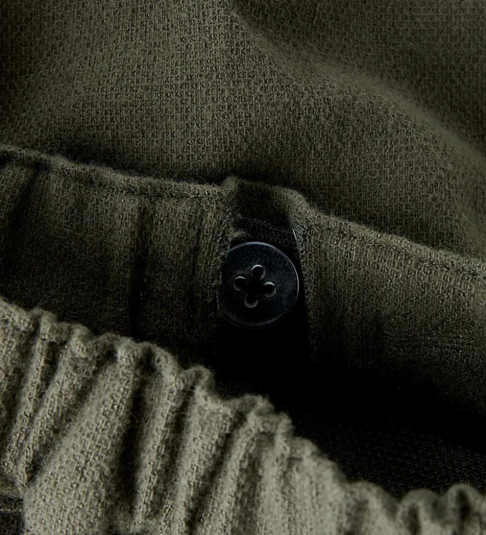 Elegante bukser fra Lil Atelier i en flot olivengrøn nuance og med en vævet struktur. Lil Atelier bukserne har en elastisk talje, der kan reguleres med knapper indvendigt, som sikrer en behagelig pasform. Bukserne har praktiske forlommer, og buksebenene afsluttes med en lige kant. Den ensfarvede stil giver et tidløst udtryk, der passer til mange lejligheder og outfits.