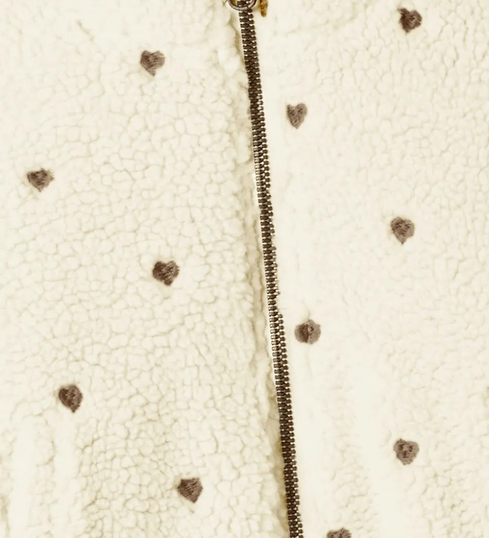 Fin Lil’ Atelier fleecejakke i hvidt teddyfleece med sorte, broderede hjerter.