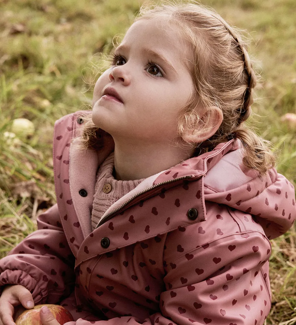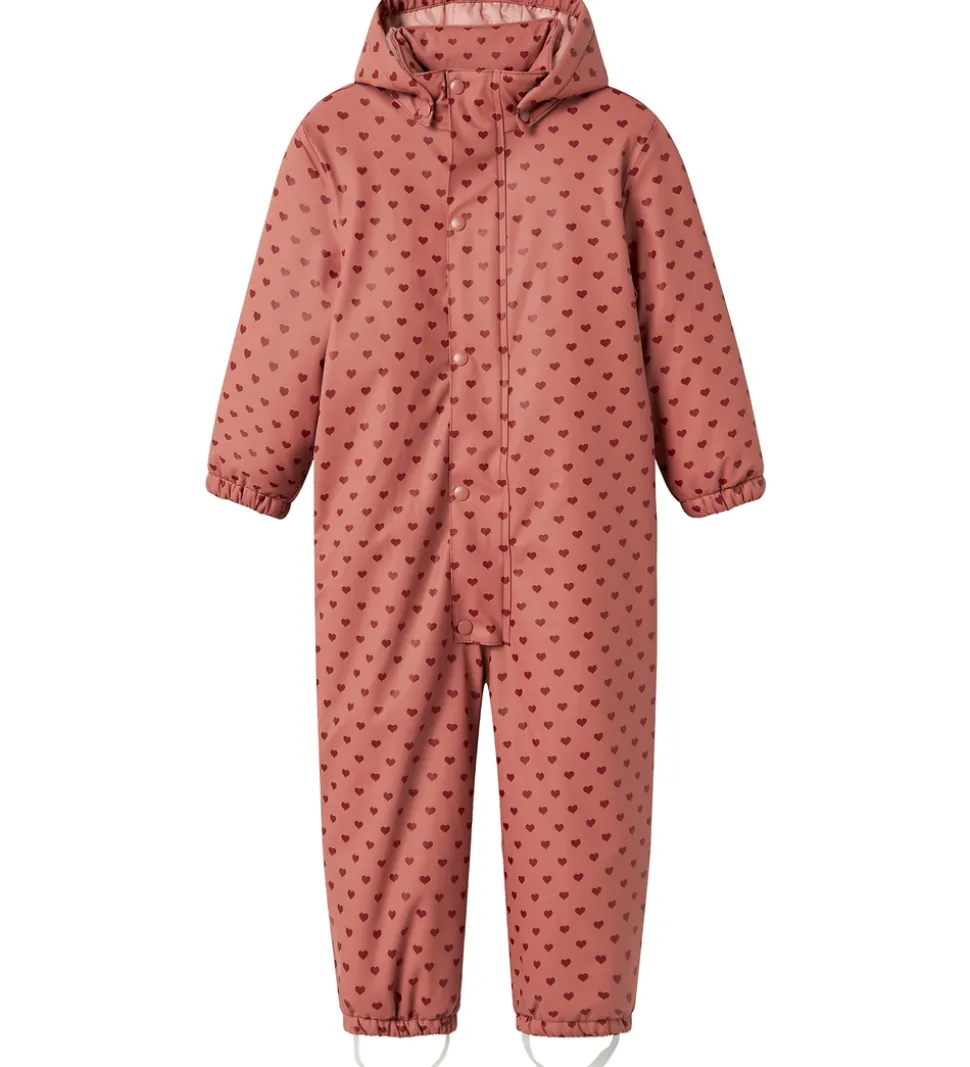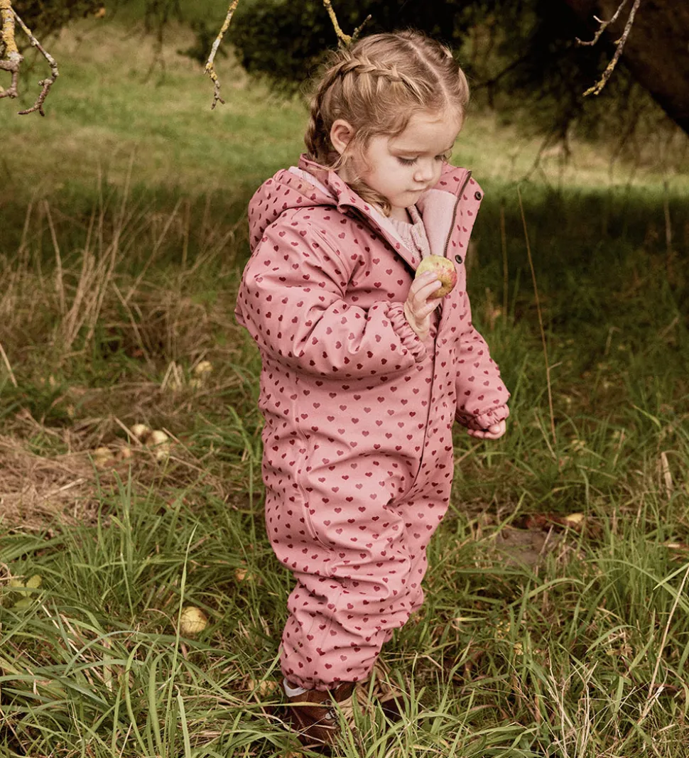 Fin Lil’ Atelier flyverdragt i rosa PU med søde hjerter i mørkerosa.