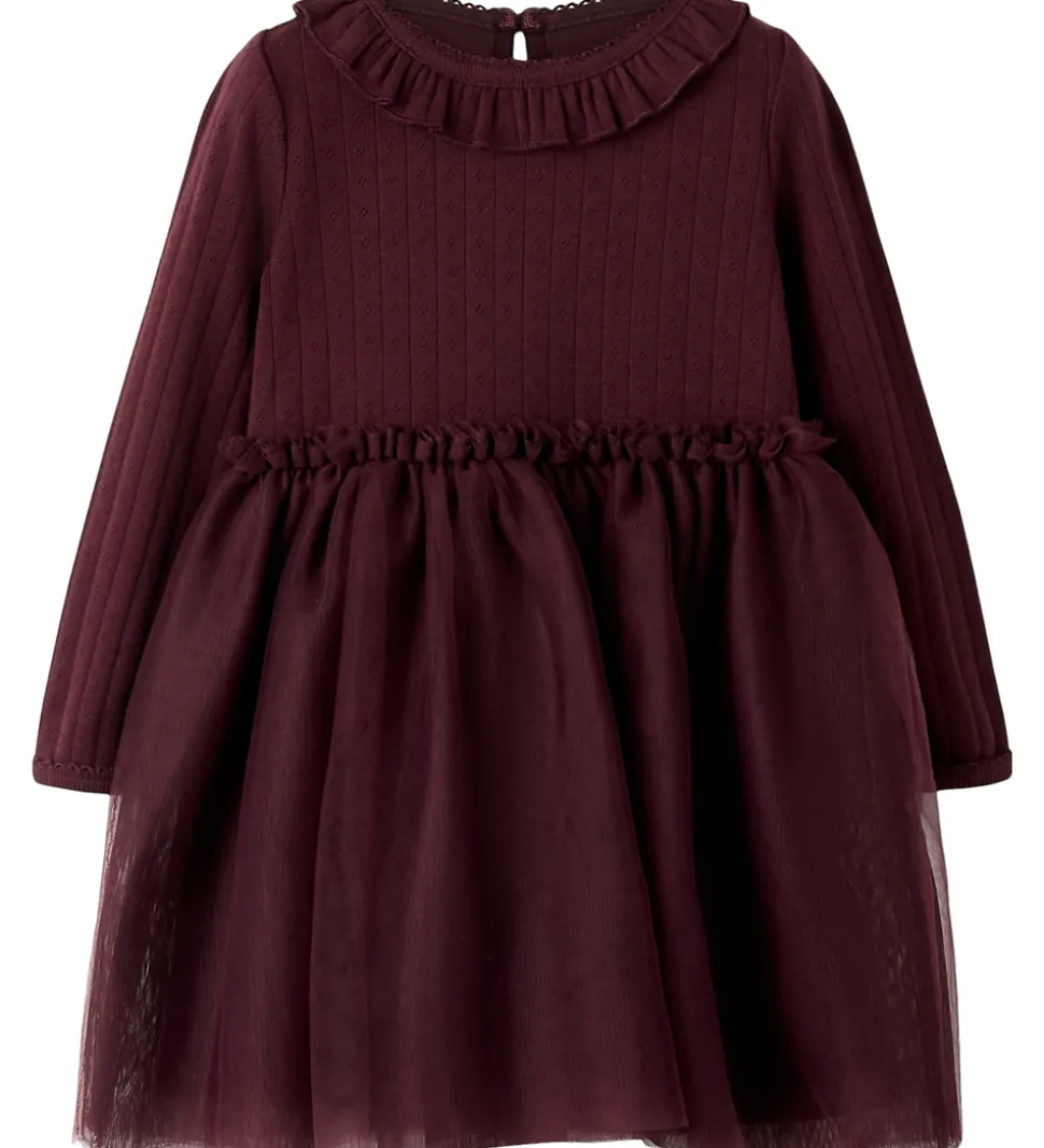 Elegant Lil Atelier kjole i bordeauxrød. Lil Atelier kjolen har fint hulmønster på den øverste del, mens den nerste del består af en lag økologisk bomuld inderst og flere lag mesh yderst. Kjolen har lange ærmer og en rund hals med flæsedetaljer og en knap i nakken.