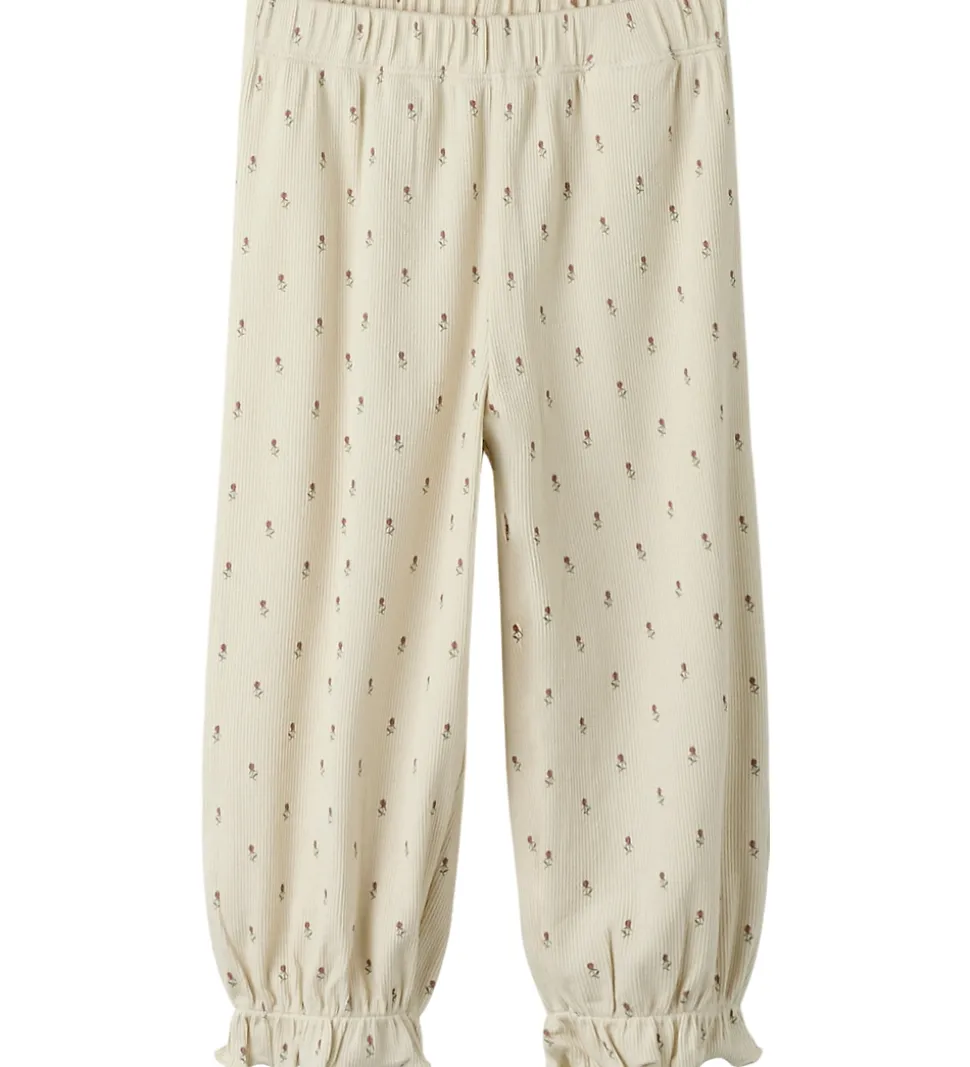 Skønt Lil Atelier nattøj bestående af en natbluse og et par natbukser i lys beige med ribstruktur og alloverprint af små blomster i rød og grøn. Natblusen har en flæsekrave og gennemhående knapper foran. Den har lange ærmer med elastik ved håndleddene. Natbukserne har brede ben med elastik i taljen og flæseaflsutning ved anklerne.