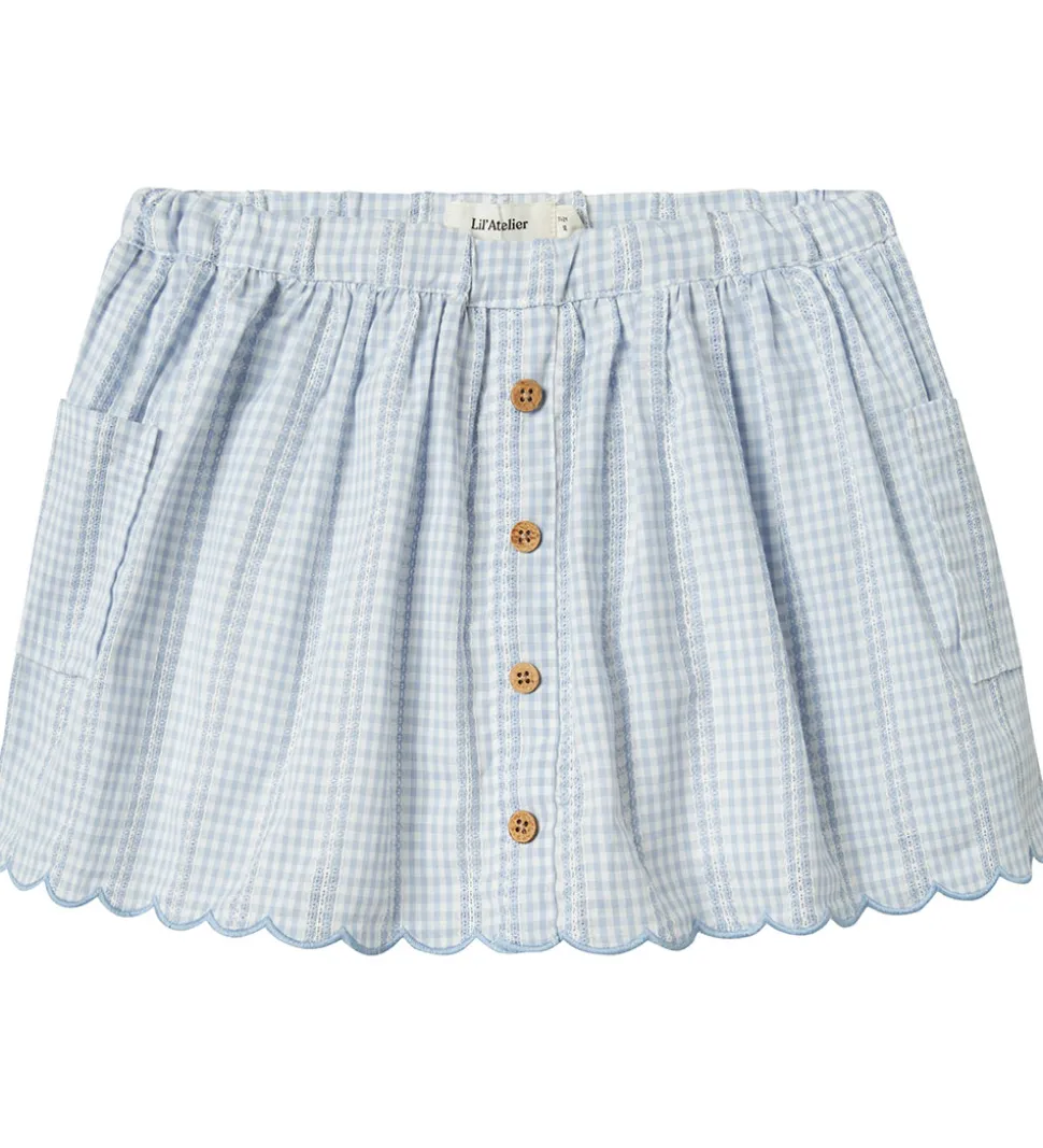 Charmerende Lil Atelier nederdel i lyseblå med et flot ternet mønster. Lil Atelier nederdelen har en justerbar elastisk talje og dekorative knapper foran. En yndig bølgedetalje langs kanten giver et elegant touch.
