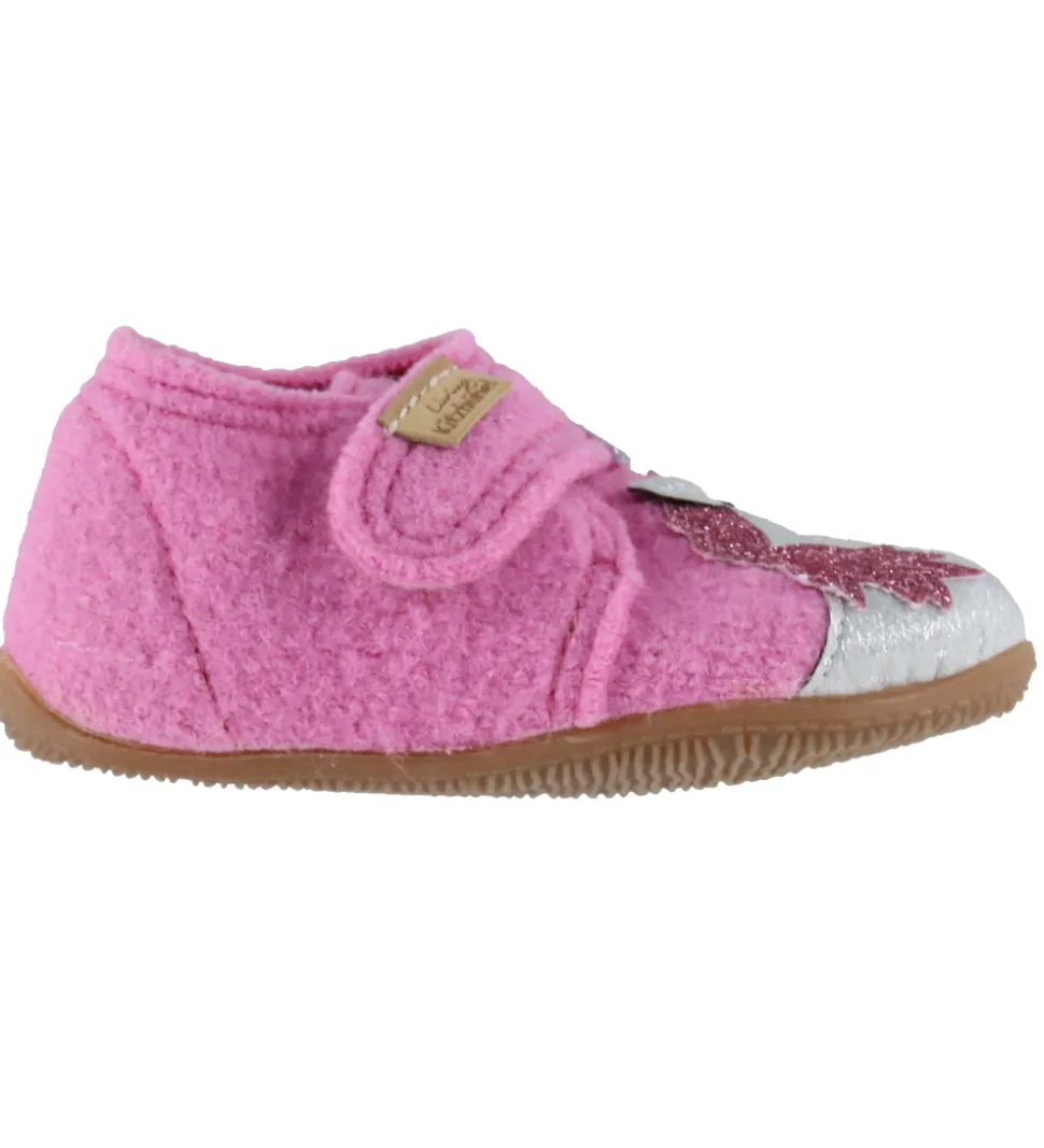 Fine Living Kitzbühel hjemmesko i pink uld med enhjørningeprint på begge fødder.