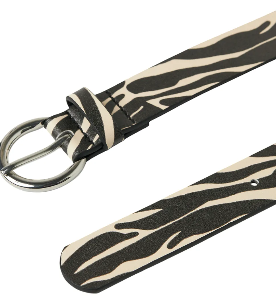 Flot LMTD bælte med zebralignende striber i sort og beige. Bæltet har en glat tekstur og et stilfuldt, sølvfarvet rundt spænde, der skaber et moderne udtryk. LMTD bæltet fremstår som en iøjnefaldende detalje med sit unikke design.
