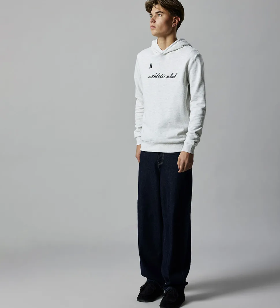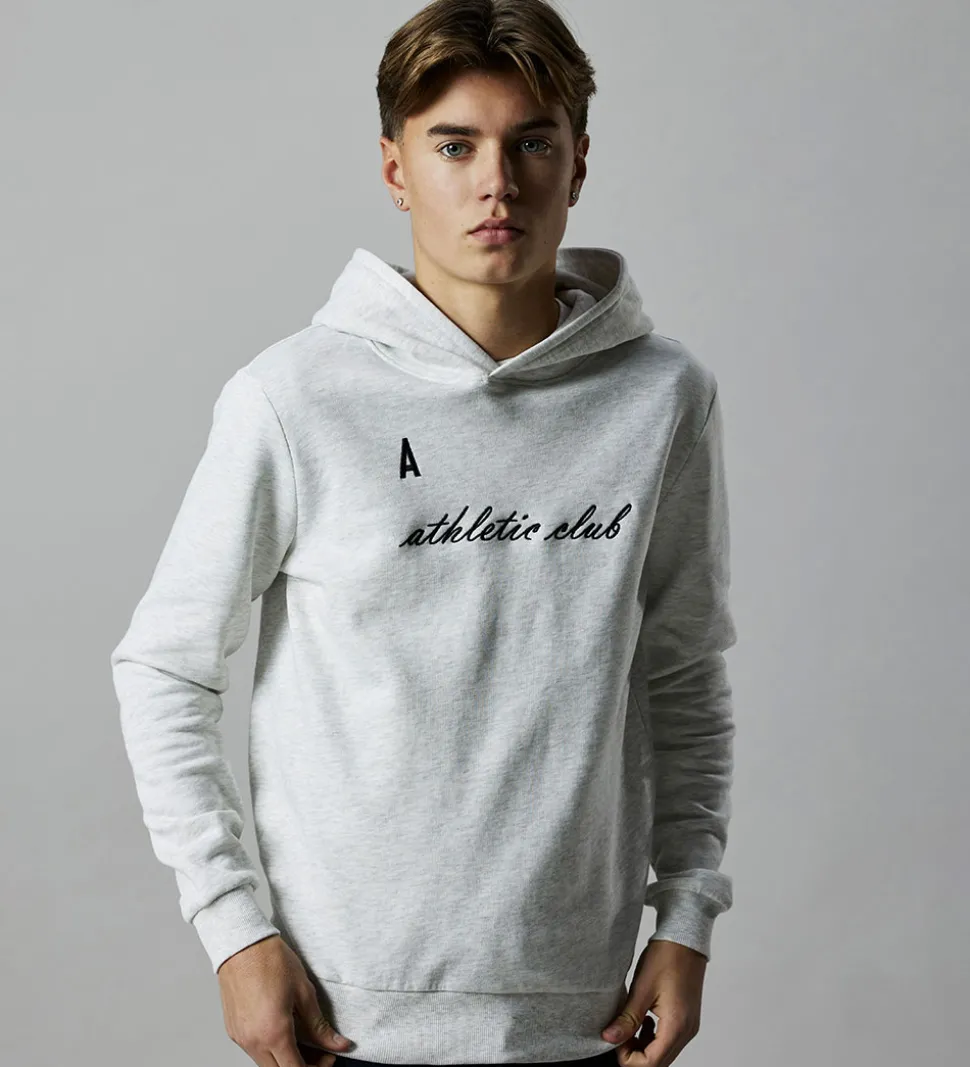 Stilren LMTD hættetrøje i en meleret, lysegrå nuance. Hættetrøjen har et enkelt og moderne design med teksten “athletic club” i sort på fronten. Detaljerne inkluderer en klassisk hætte samt ribkanter ved ærmerne og nederst for et afslappet look.
