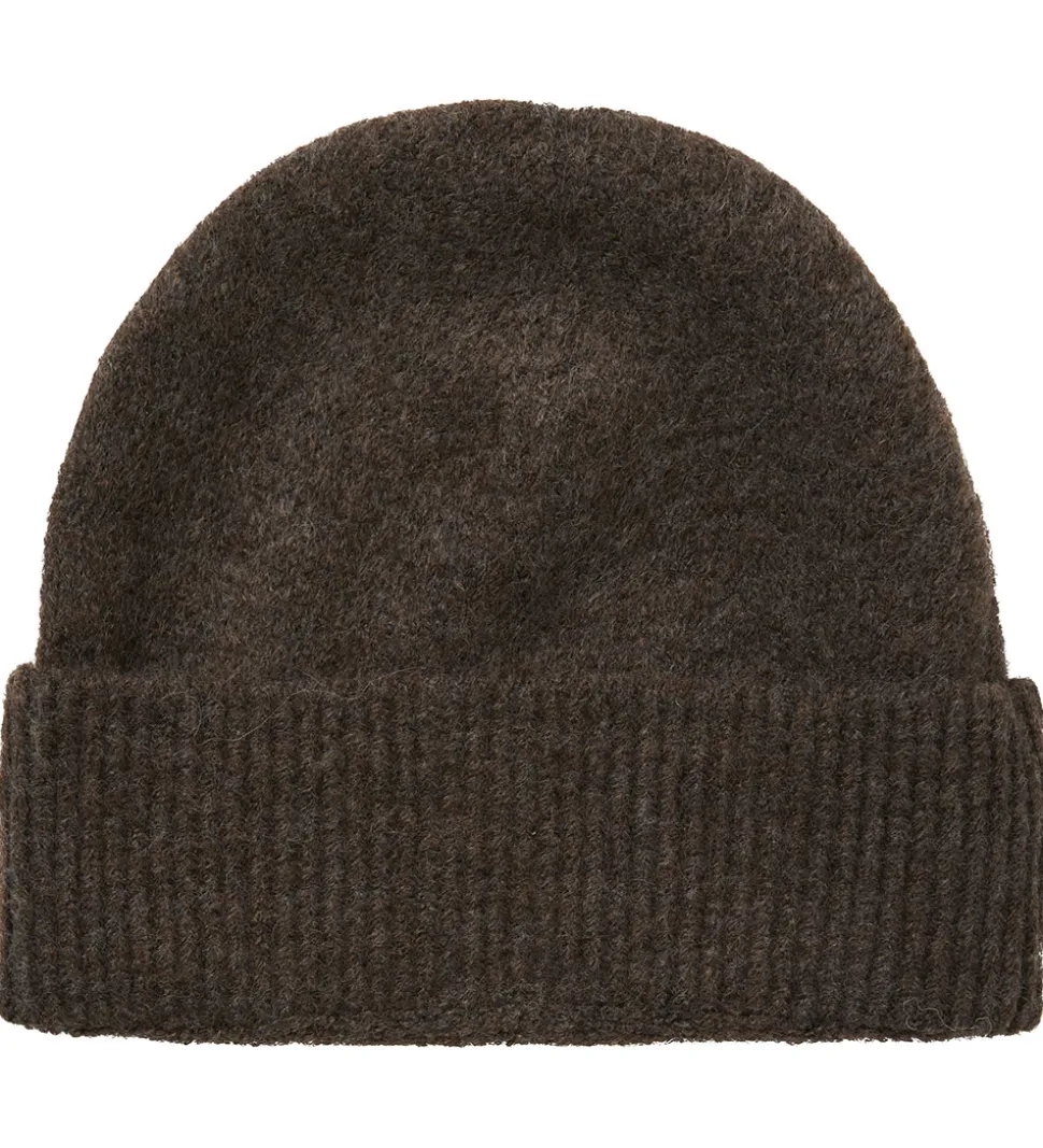 Flot LMTD hue i mørkebrun strik. Huen har en rund hovedform og et bredt ombuk nederst med ribstruktur.