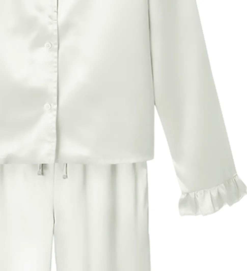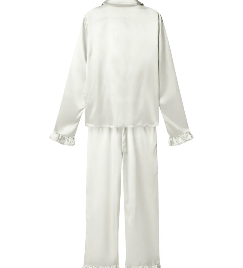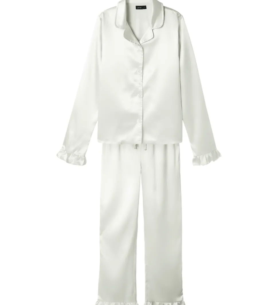 Fint LMTD nattøj bestående af en natskjorte og et par natbukser i cremefarvet satin. Natskjorten har en skjortekrave og gennemgående knapper fortil. I ærmeåbningerne er der fine flæsedetaljer. Natbukserne har en bred elastik i taljen, som kan justeres med snører fortil. I benåbningerne er der flæseafslutning. Nattøjet er fremstillet i en blød og let kvalitet.