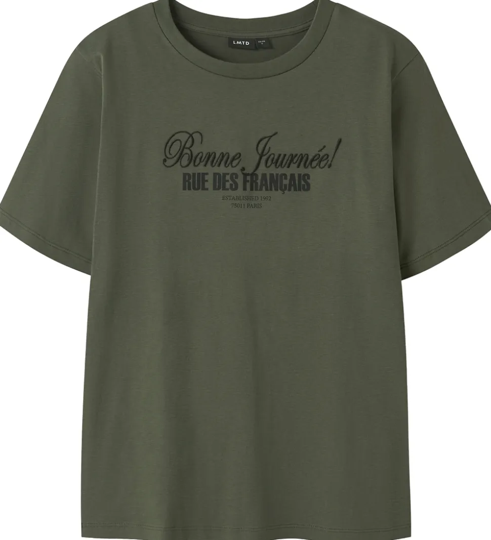 Stilfuld LMTD t-shirt i støvet grøn med sort tekstprint. LMTD t-shirten har en klassisk rund halsudskæring med en smal ribkant og korte ærmer.