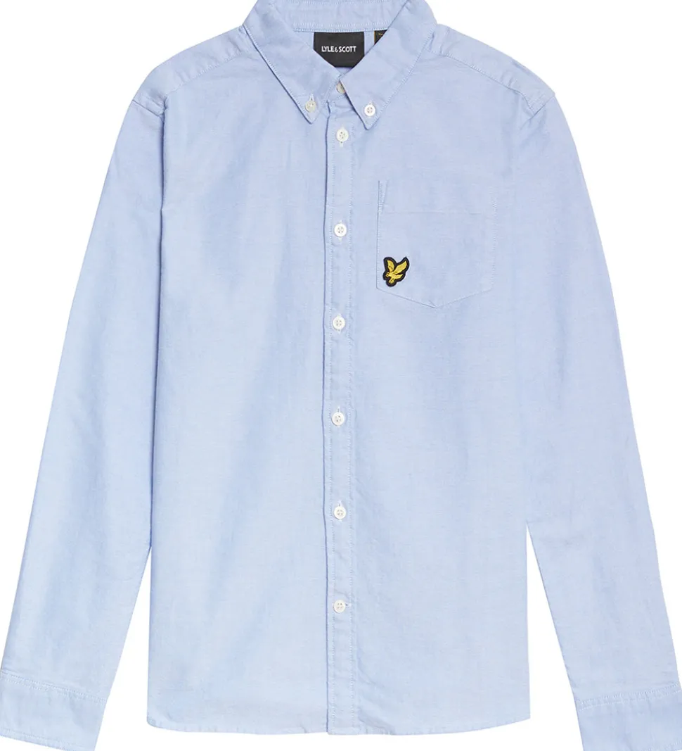 Flot Lyle & Scott skjorte i ensfarvet lyseblå med et lille, gult logo-patch fortil i venstre side.