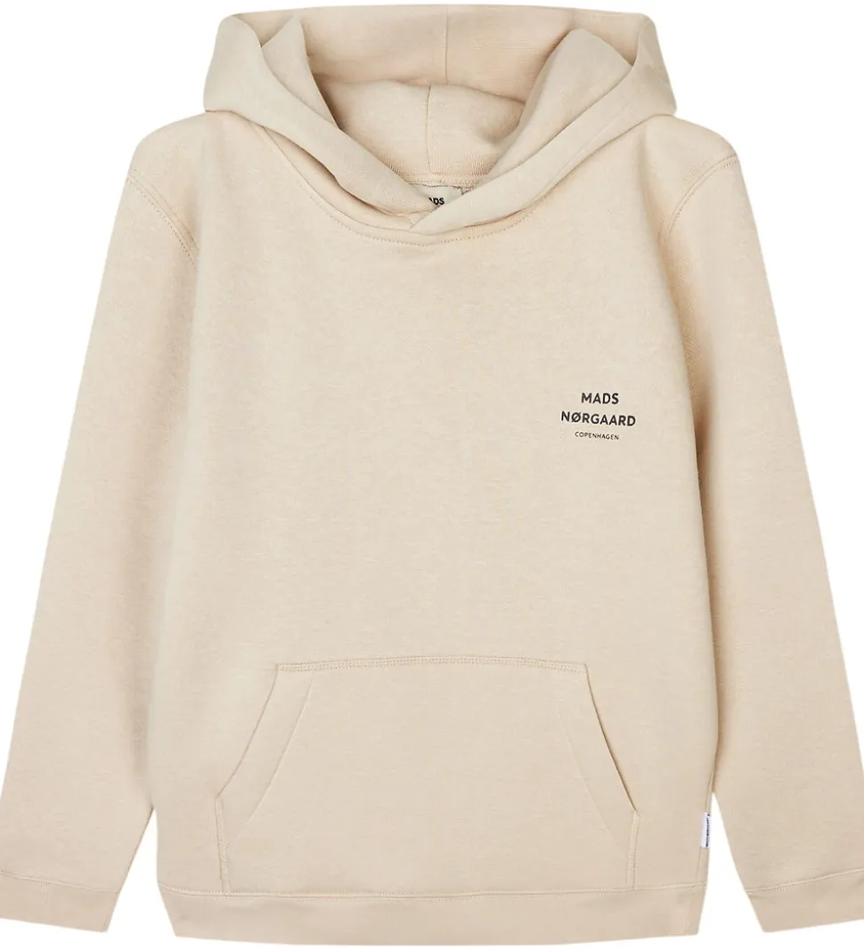 Elegant Mads Nørgaard hættetrøje i lys beige sweat. Hættetrøjen har et diskret logoprint på brystet i sorte bogstaver. Den er designet med en praktisk kængurulomme på fronten. Hættetrøjen har ribkanter ved ærmerne og forneden, der sikrer en god pasform. Mads Nørgaard tilbyder her en stilfuld hættetrøje med en enkel struktur. Hættetrøjen har blødt, børstet bomuld på indersiden.