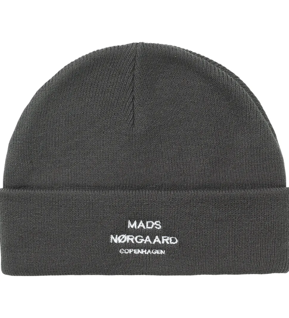 Lækker Mads Nørgaard hue i mørkegrå strik med et hvidt logo broderet fortil.