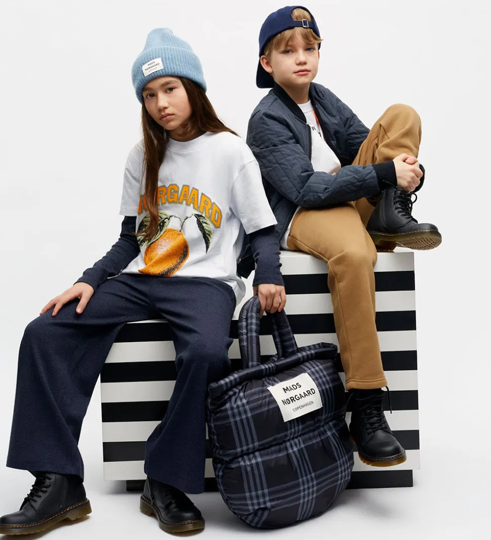 Flot Mads Nørgaard t-shirt i hvid med et stort print af en appelsin i orange og grøn samt et stort logoprint. Mads Nørgaard t-shirten har en klassisk rund halsudskæring og korte ærmer, der giver et enkelt og moderne udtryk.