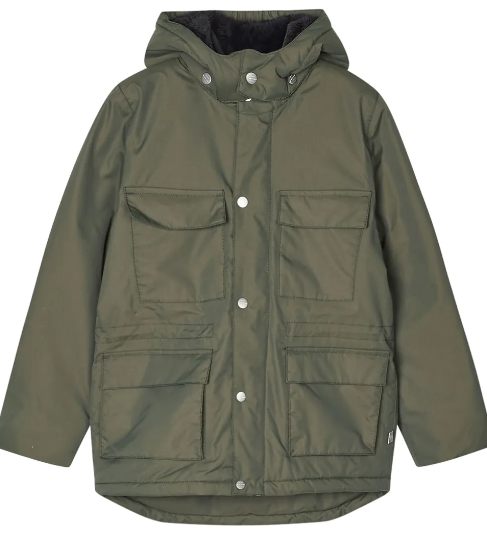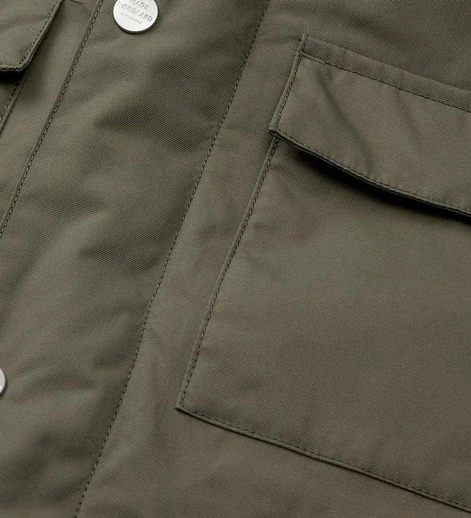 Skøn Mads Nørgaard vinterjakke i ensfarvet mørkegrøn. På venstre ærme er der et fint logo, og nederst på ryggen er der stribede reflekser.