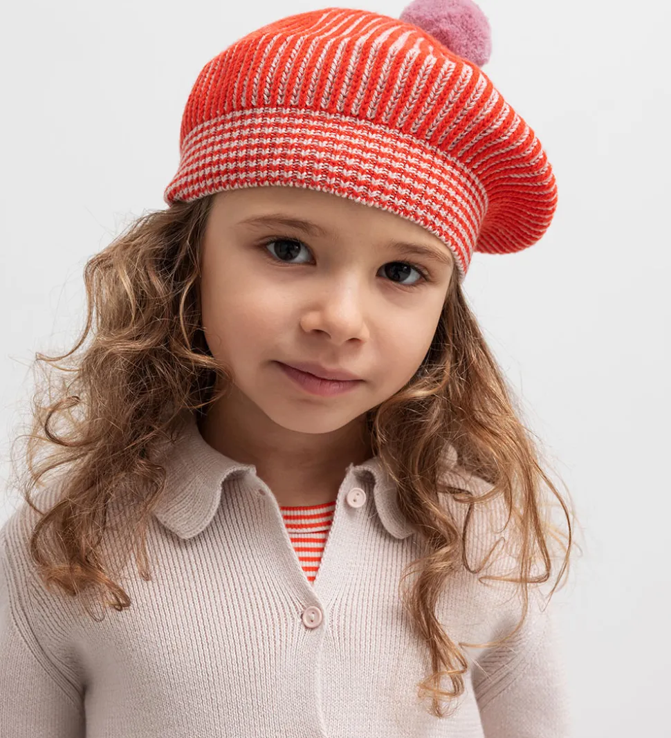 Flot MarMar hue i rød og hvid med striber i en strikket kvalitet. Huen er dekoreret med en markant rosa pompon på toppen, som tilføjer et stilfuldt touch. MarMar huen kombinerer et klassisk design med moderne elementer, hvilket gør den til et tidløst valg.