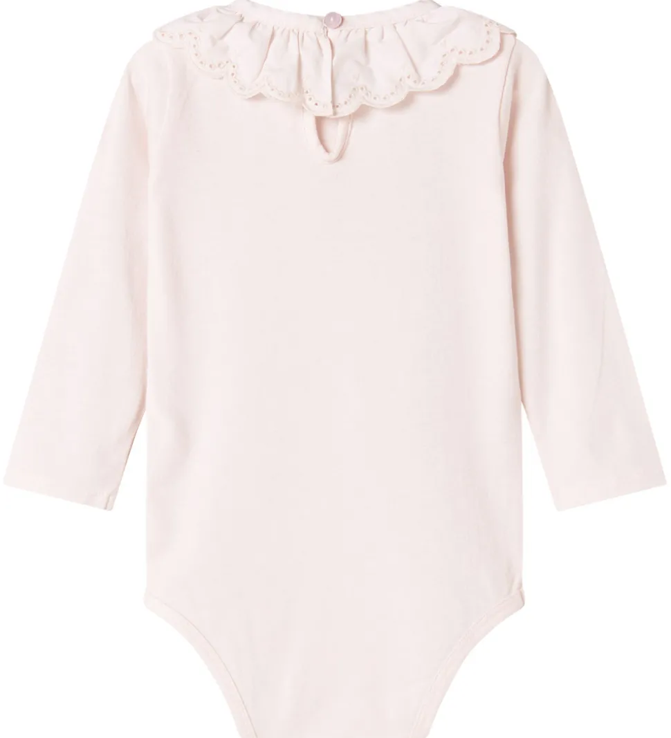 Elegant MarMar body i en sart, lyserosa farve. Denne body er udstyret med lange ærmer og har en dekorativ flæsekrave, der tilføjer et klassisk touch. Pasformen er designet med kantede detaljer ved ærmer og ben, hvilket giver et rent look.