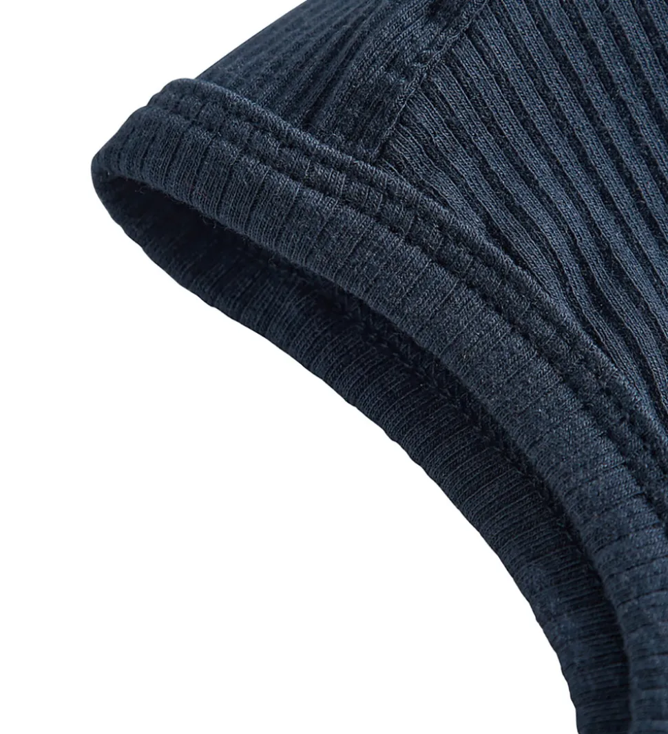Smart MarMar elefanthue i en dyb, blå farve med ribstruktur. MarMar elefanthuen har en rund hovedform, og en smal kant i ansigtsåbningen. Elefanthuen har et pratkisk split-design i bunden, og den består af et enkelt lag bomuld.