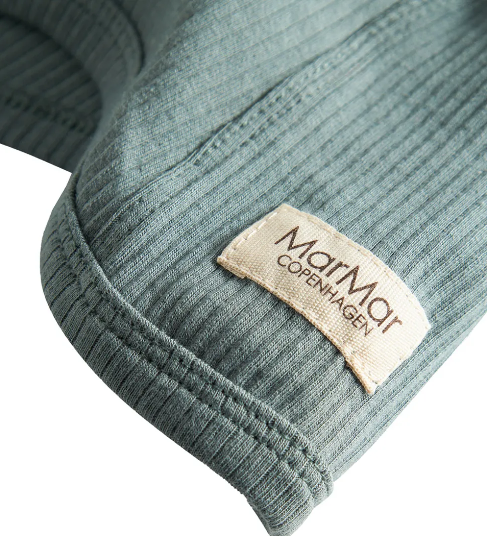 Elegant MarMar elefanthue i en afdæmpet grøn farve med ribstruktur. MarMar elefanthuen har en rund hovedform med en diskret split-effekt i bunden. Den har en strømlinet pasform uden print og er lavet i et blødt materiale.