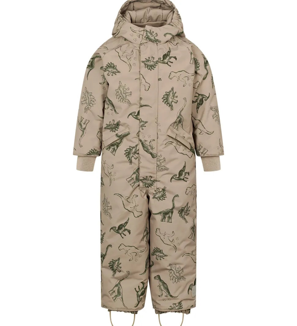 Skøn MarMar flyverdragt i lysegrøn med et alloverprint af dinosaurer i grønne nuancer. Flyverdragten har praktiske refleksdetaljer.