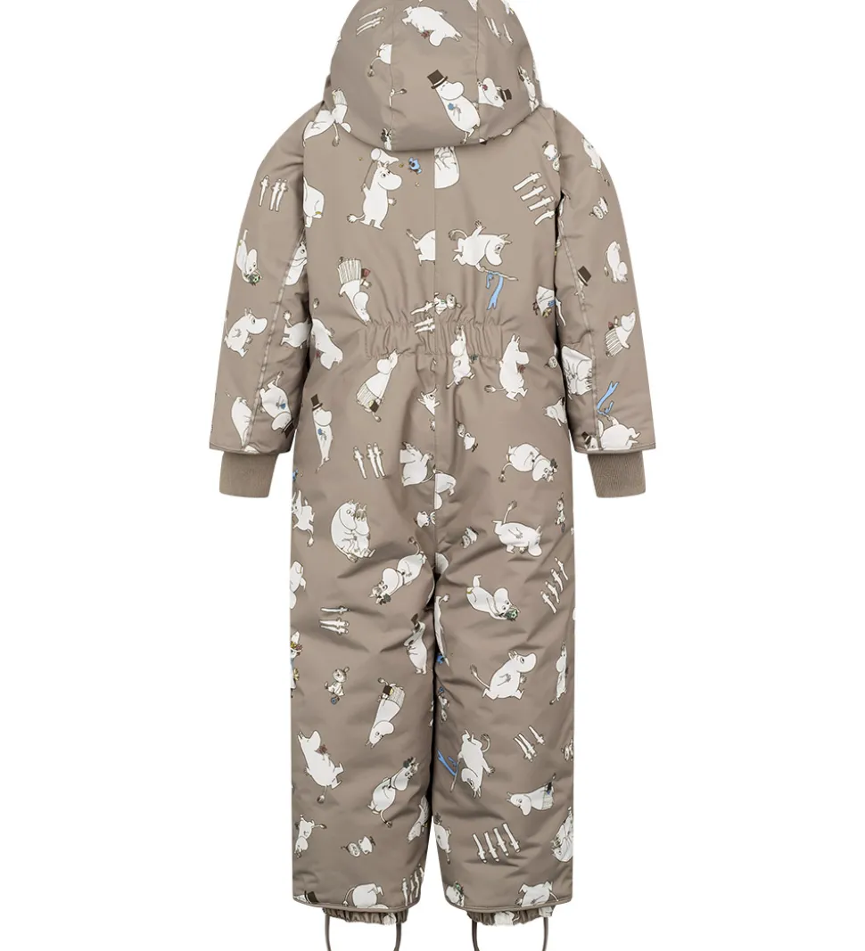 Fin MarMar flyverdragt i grågrøn med et alloverprint af motiver fra Mumitroldene. Flyverdragten har praktiske refleksdetaljer.