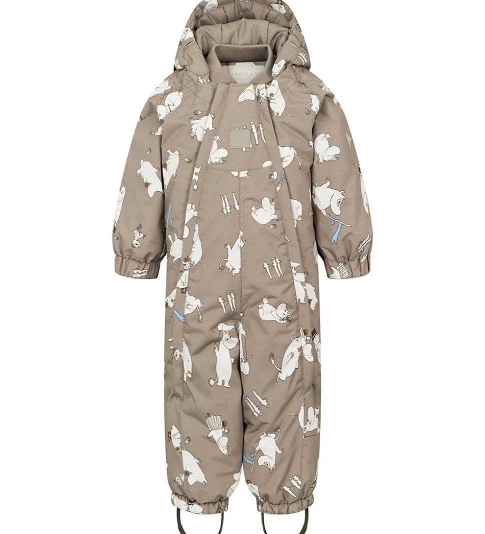 Sød MarMar flyverdragt i grågrøn med et alloverprint af motiver fra Mumitroldene. Flyverdragten har praktiske refleksdetaljer.