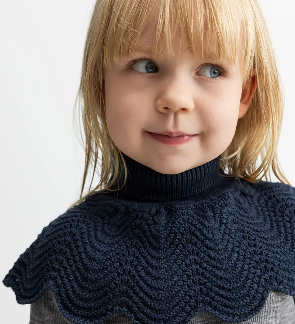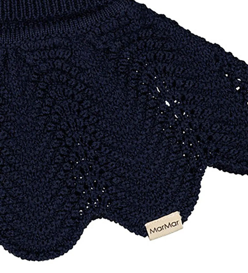Elegant MarMar halsedisse i en dyb, marineblå farve med et flot hulmønster. MarMar halsedissen har en ombukket ribkant ved halsåbningen og en bølget strikstruktur langs kanten.