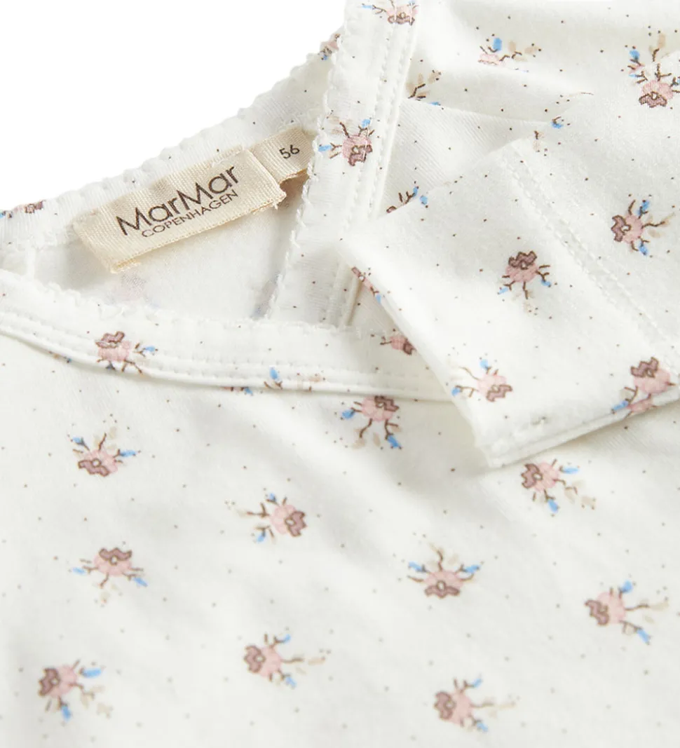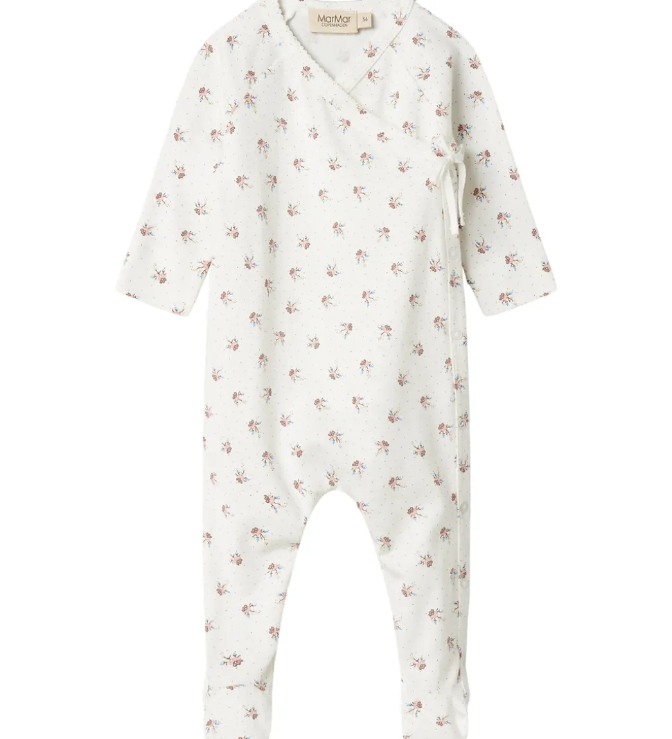 Charmerende MarMar heldragt i hvid med et delikat blomsterprint og små prikker. Denne heldragt har lange ærmer og ben, som giver et stilrent udtryk. MarMar designet er udstyret med en praktisk slå-om lukning med bindebånd og trykknapper.