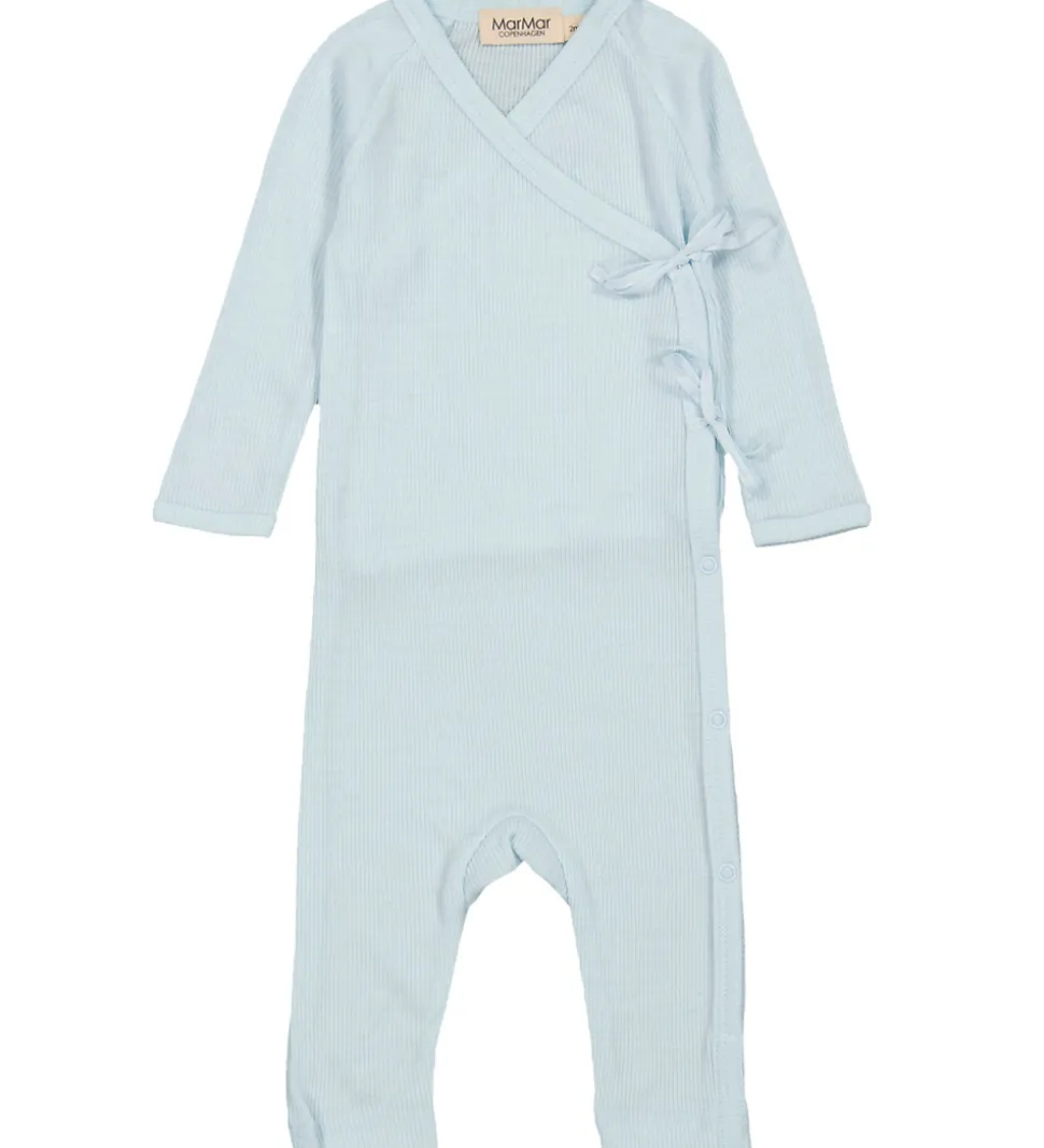 Elegant MarMar heldragt i en lyseblå farve med en struktureret overflade. Designet er enkelt og klassisk, med lange ærmer og ben.