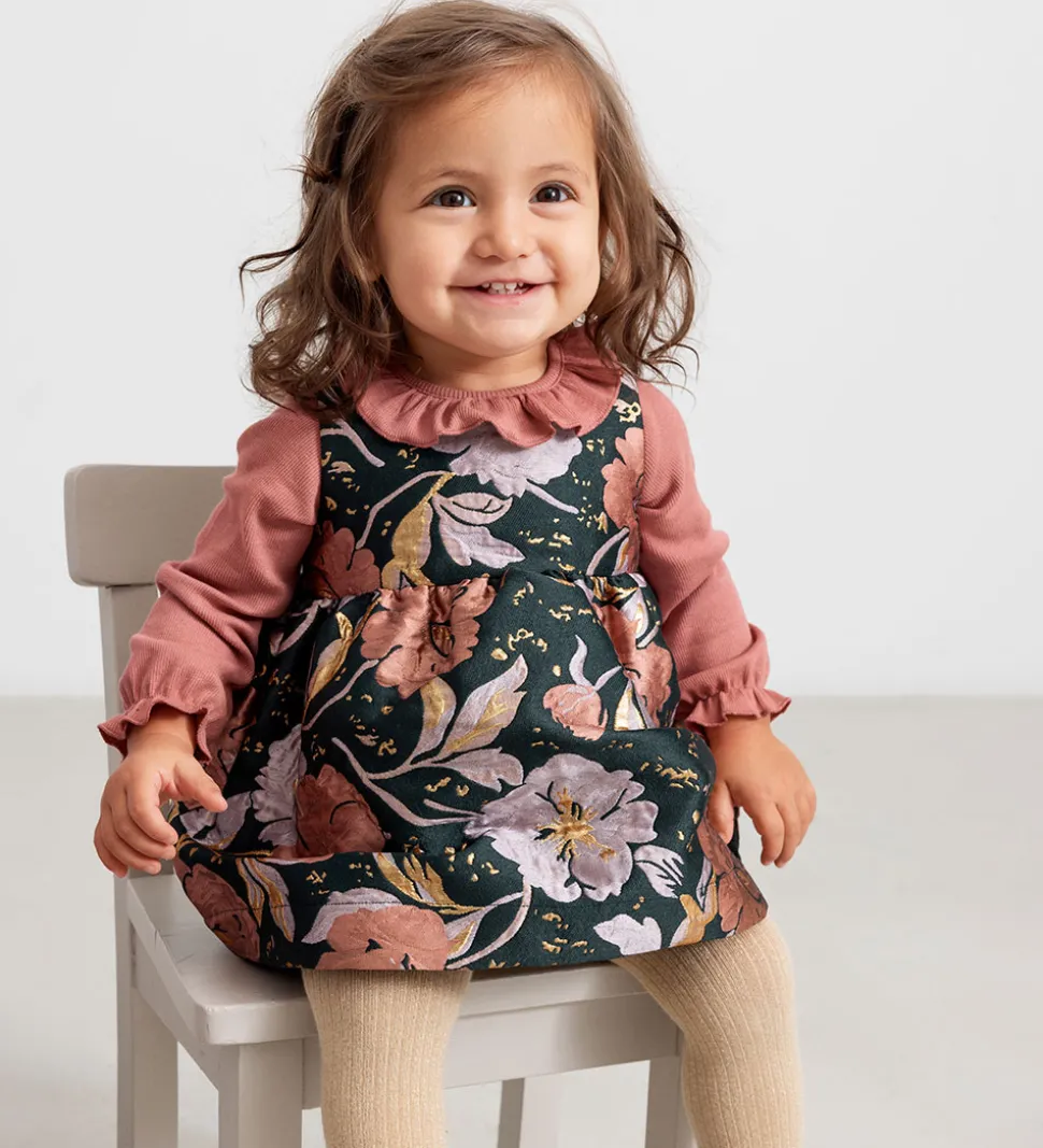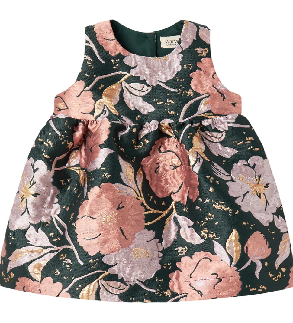 Elegant MarMar kjole med et blomstrende jacquard-mønster i nuancer af rosa og guld på en mørkegrøn baggrund. MarMar kjolen har en ærmeløs struktur med en rund halsudskæring og en diskret lynlås bagpå. Stoffet har en let skinnende overflade, der giver den et fornemt udtryk.