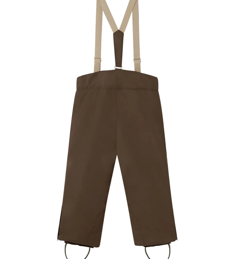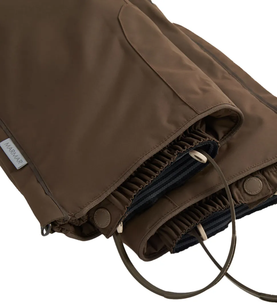 Smarte MarMar skibukser i mørkebrun med lyse seler og refleksdetaljer langs ydersiden af benene.