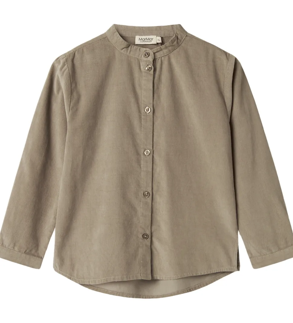 Enkel MarMar skjorte i en stilren brun nuance, og den er lavet af blødt fløjl i en fastvævet kvalitet. Skjorten har lange ærmer og en rund halsudskæring uden krave, der giver et moderne udtryk. MarMar skjorten er udstyret med en gennemgående knaplukning og en let buet kant forneden, hvilket sikrer en flot pasform.
