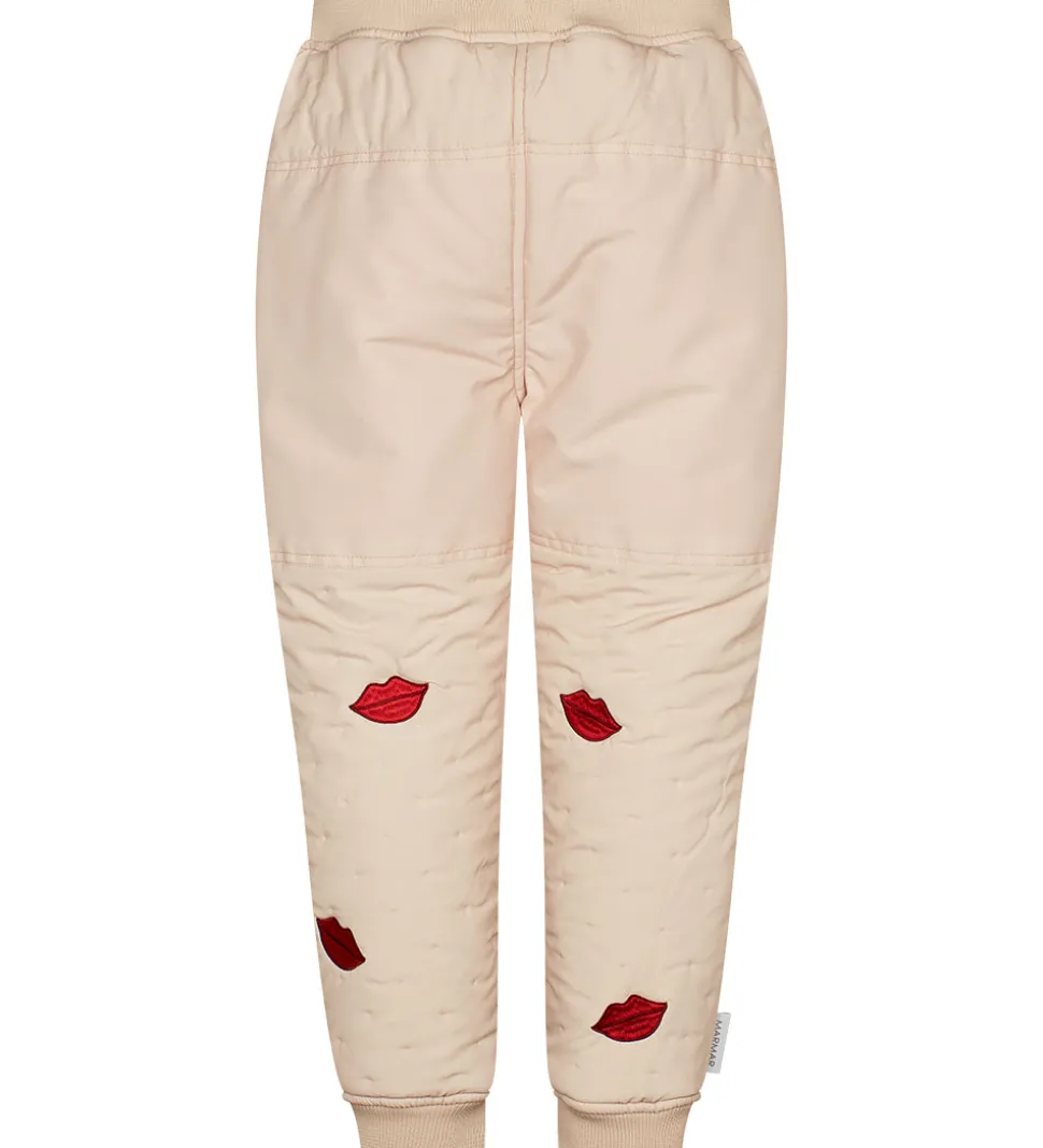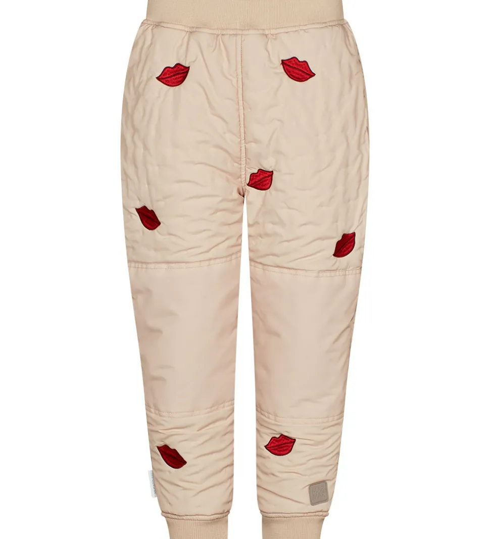 Skønne MarMar termobukser i beige med broderede, røde kyssemunde. Termobukserne har en quiltet struktur af små, indprægede prikker.
