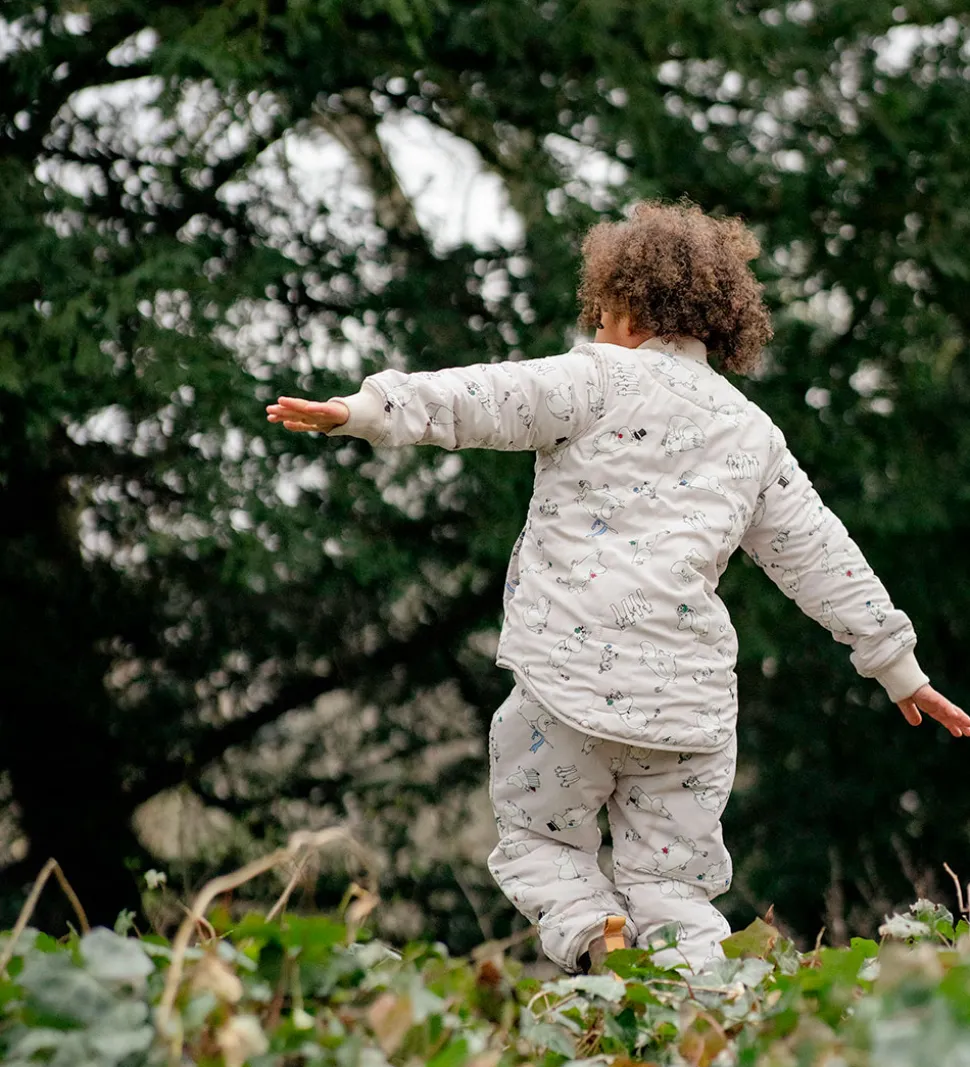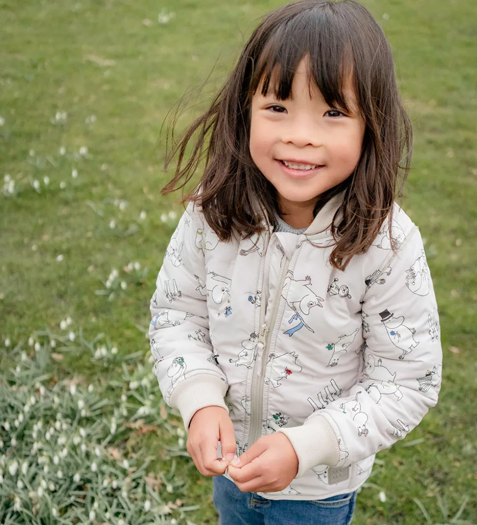 Skøn MarMar termojakke i lys beige med alloverprint med de søde Mumitrolde og motiver fra Mumidalen. Termojakken har en quiltet struktur af små, indprægede prikker.