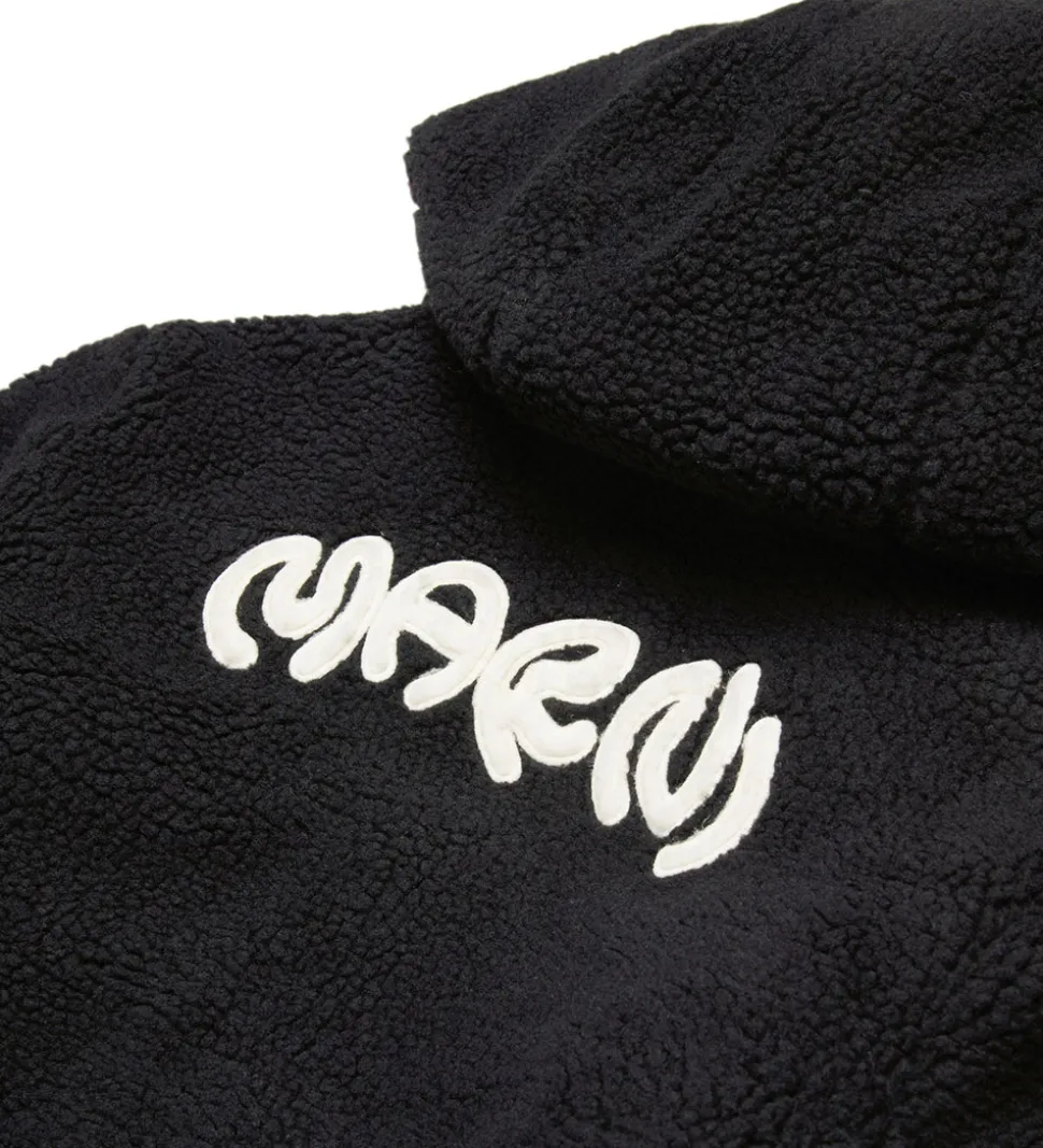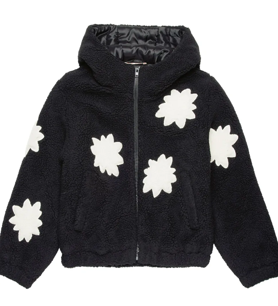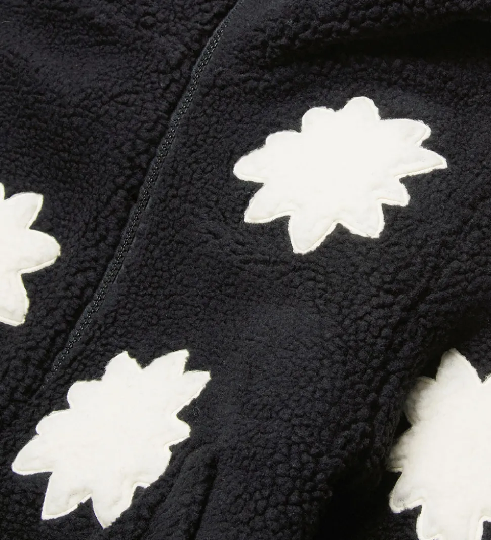 Lækker Marni fleecejakke i sort teddyfleece, og fortil og på ærmerne sidder der store, hvide snefnug. På ryggen står der “Marni” med store, hvide bogstaver.