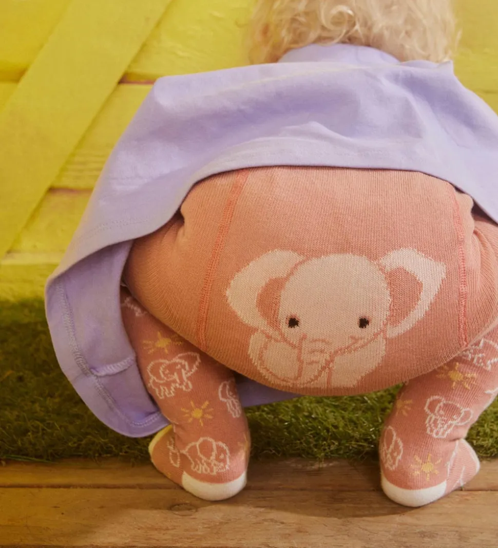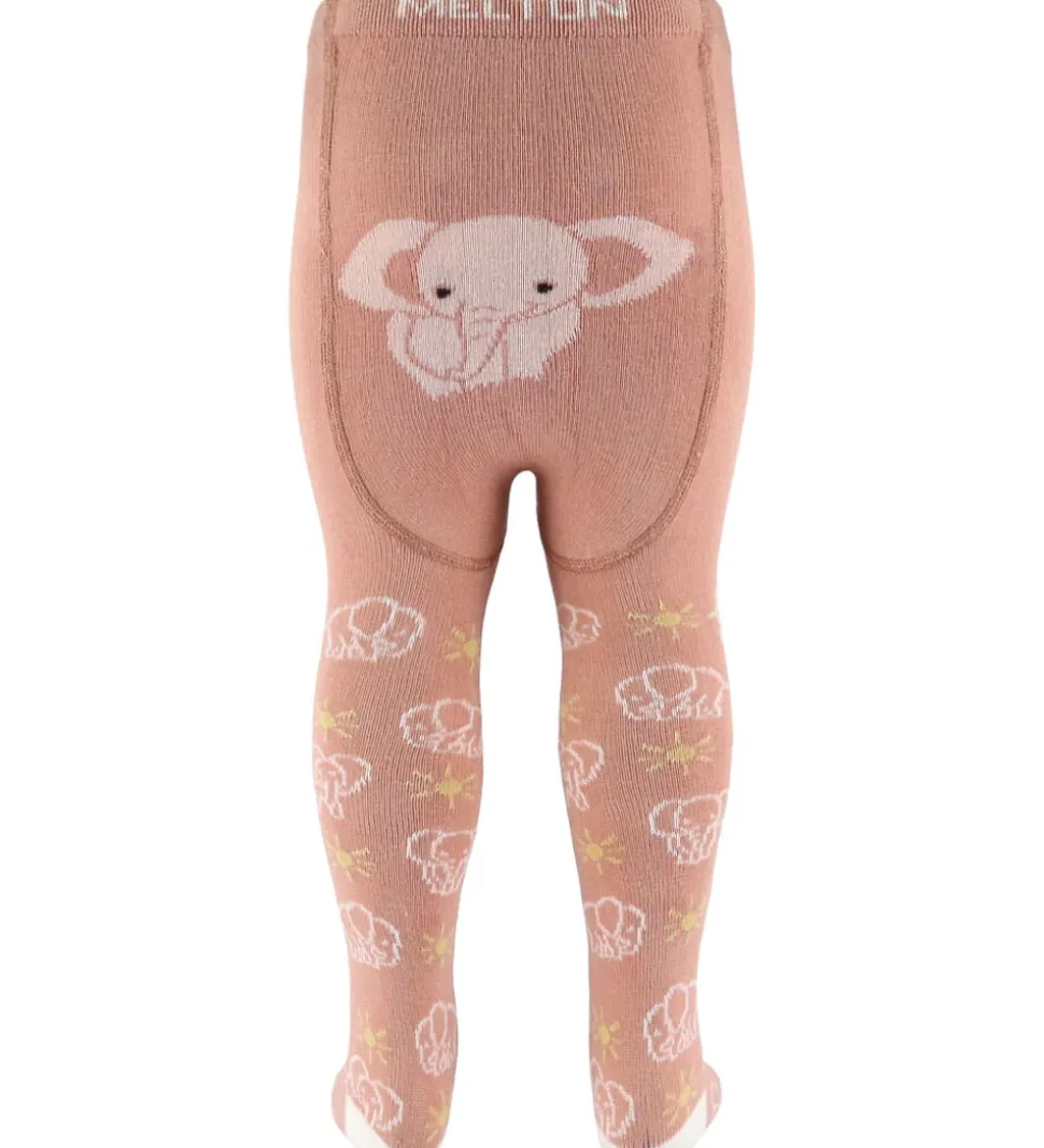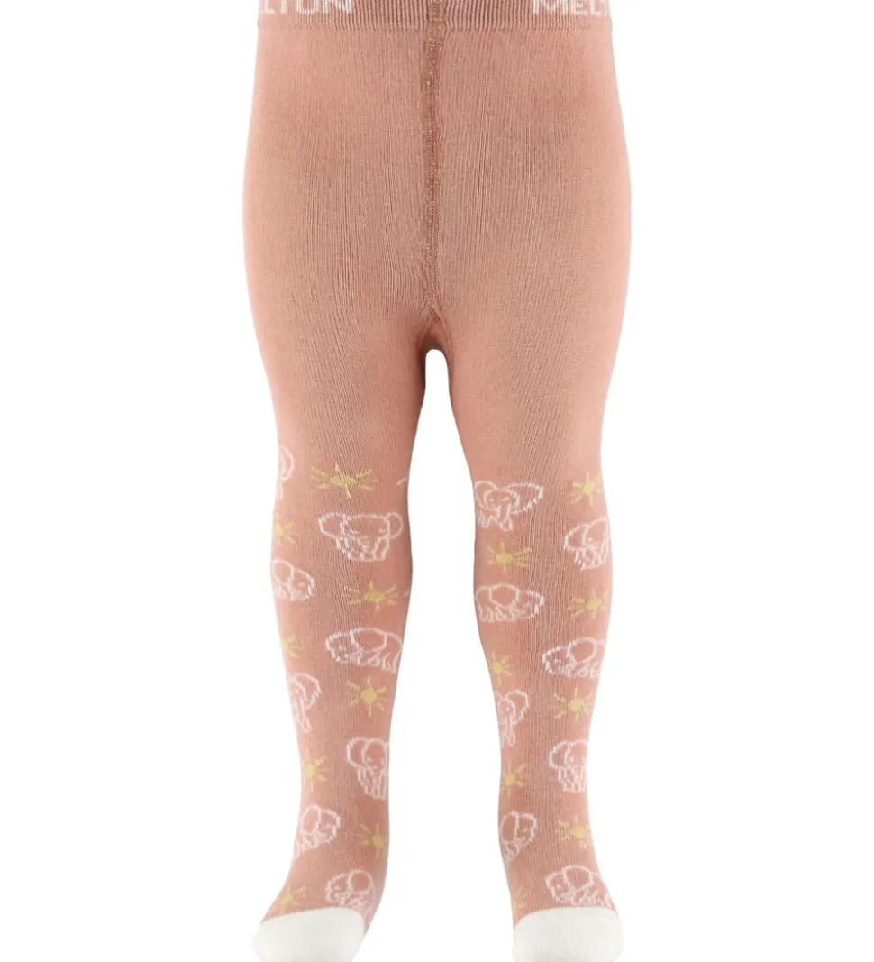 Skønne Melton strømpebukser i rosa med et print på benene af elefanter og sole i hvid og gul. Strømpebukserne har en hvid hæl og tæer.