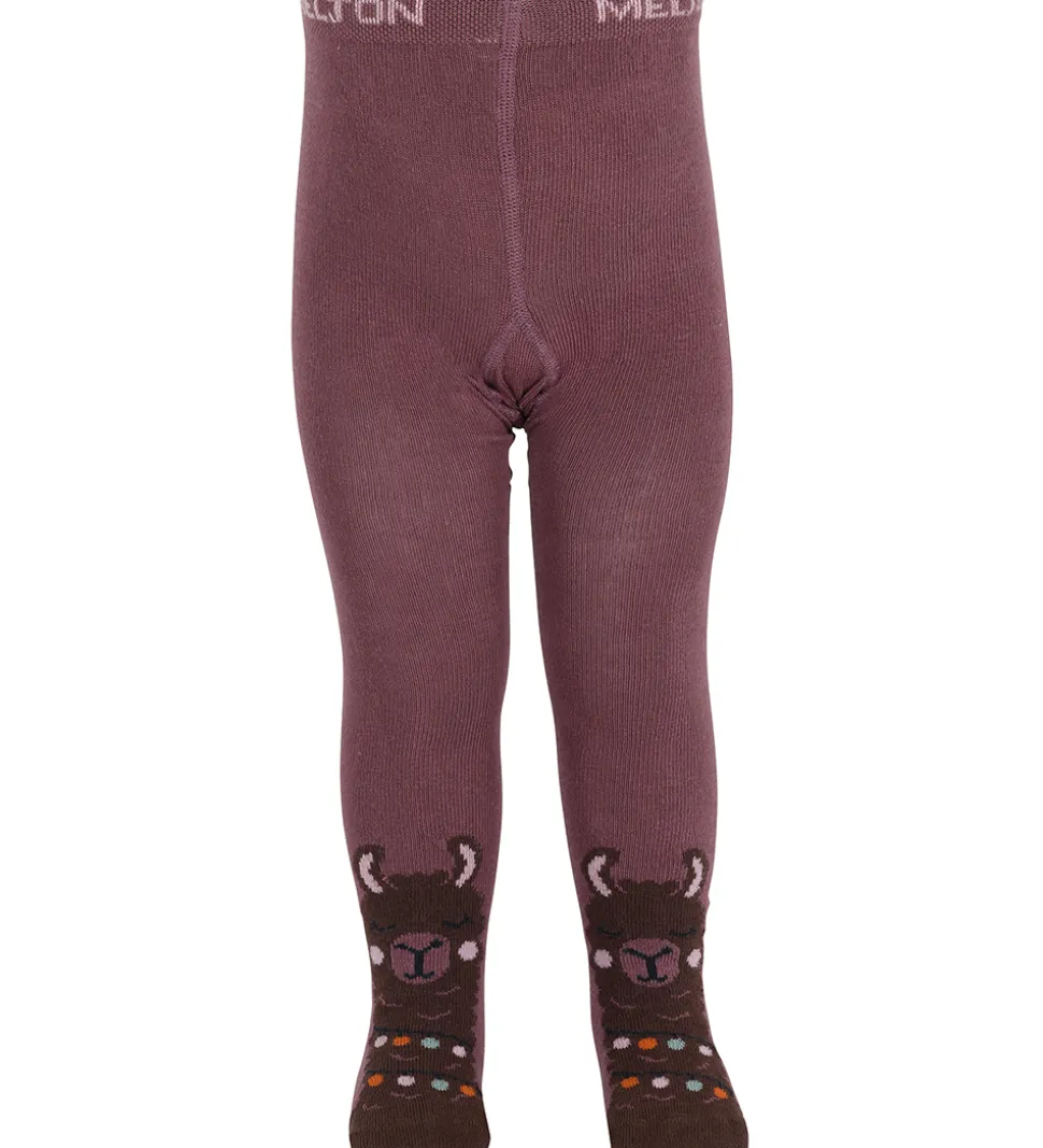Søde Melton strømpebukser i en støvet lilla farve med et fint motiv af en brun lama på fødderne og farverige lyskæde under.