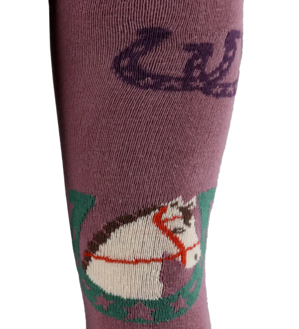 Herlige Melton strømpebukser i lilla med hestesko og hesteprint. Disse strømpebukser har en elastisk talje for en god pasform. Detaljerede illustrationer af heste tilføjer et charmerende præg til Meltons design.