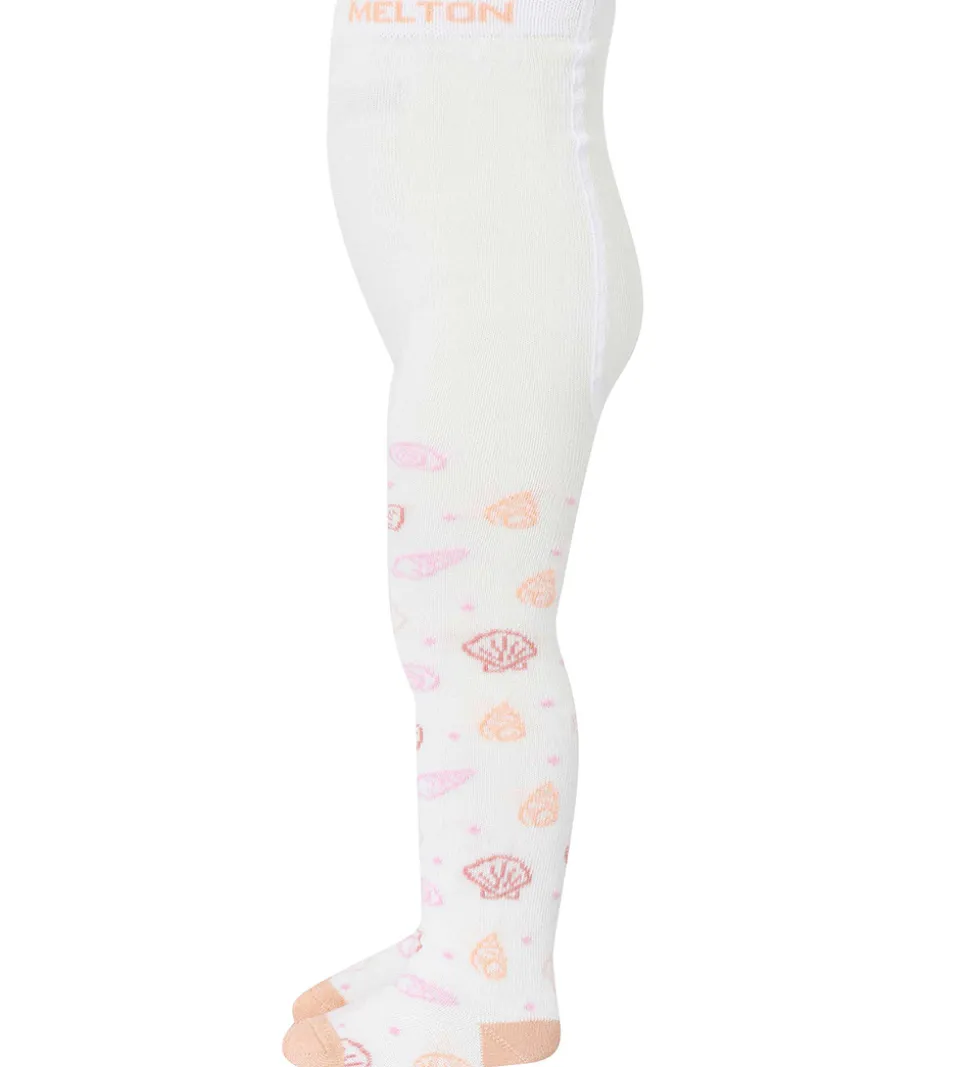 Skønne Melton strømpebukser i hvid med et print af muslingeskaller i rosa og orange. Strømpebukserne har en orange hæl og tæer, med guldglimmer.
