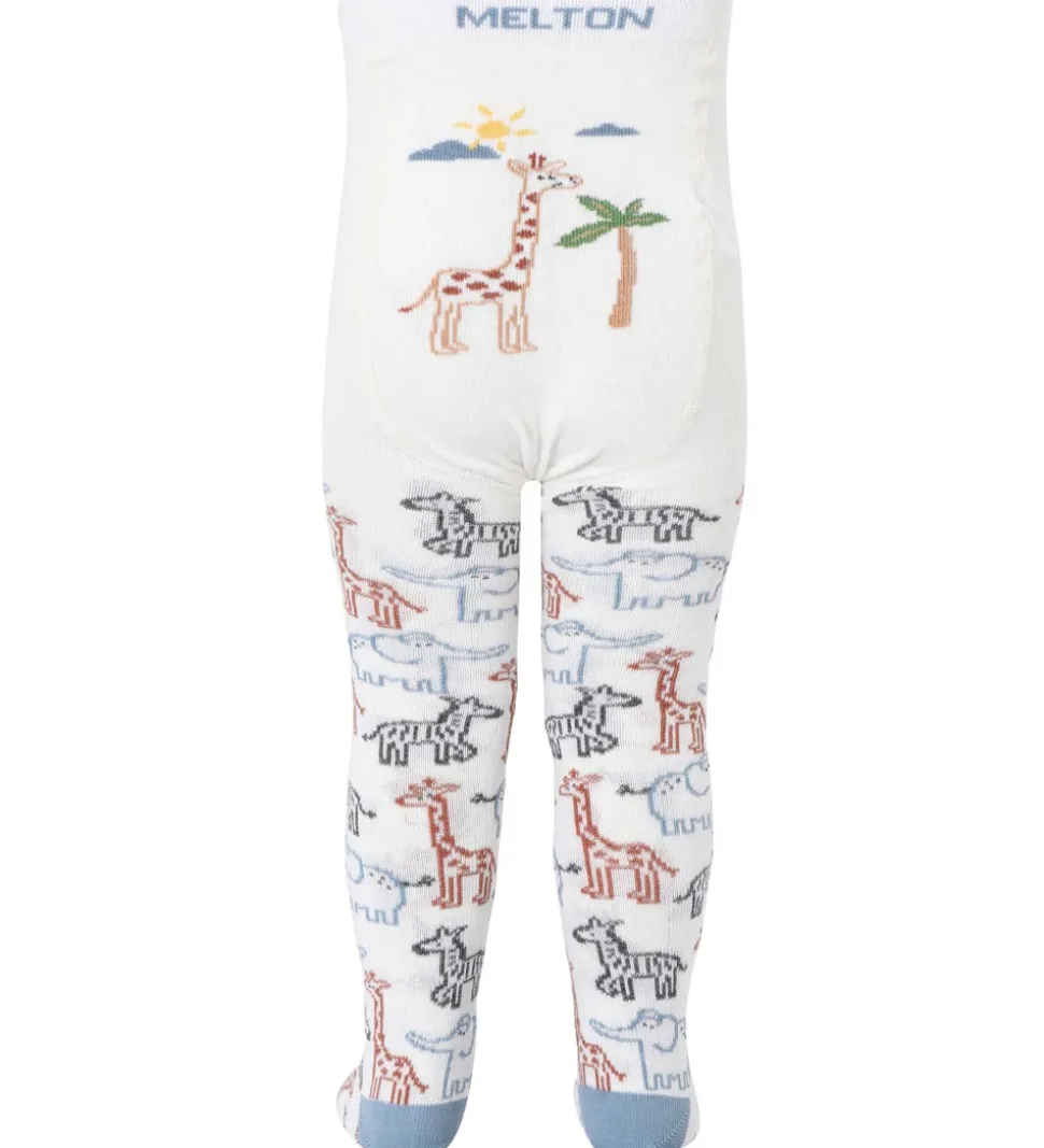 Skønne Melton strømpebukser i hvid med et print på benene af elefanter, giraffer og zebraer i blå, brun og grå. Strømpebukserne har en støvet blå hæl og tæer.