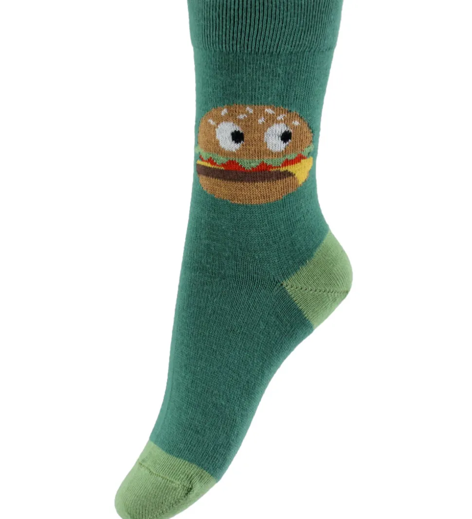 Charmerende Melton strømper i en flot grøn nuance med et sjovt burger-motiv ved anklen. Strømpernes skaft er langt med en ribkant for optimal pasform. Melton strømperne har desuden en lysegrøn hæl og tå, der tilføjer en ekstra farverig detalje.