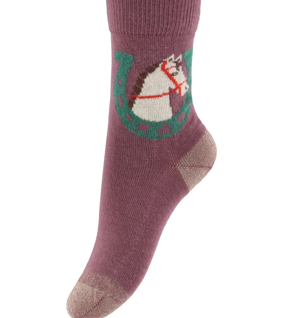 Flotte Melton strømper i lilla, og på siderne af skaftet er der en hvid hest indeni en grøn hestesko. Strømperne har en smal ribkant øverst, og de har glimmer ved tå og hæl.