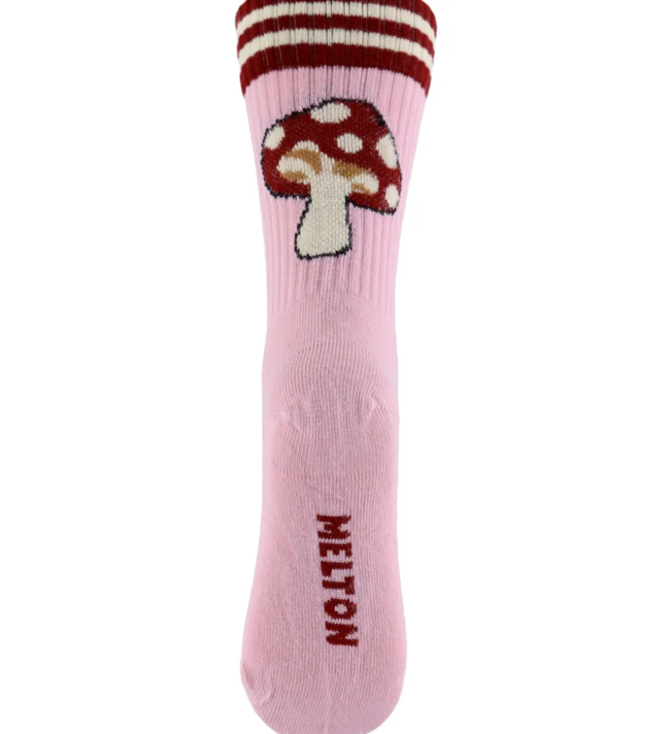 Flotte Melton strømper i rosa med et print af en rød svamp på bagsiden af skaftet. Strømperne har et stribet skaft i rød og hvid, samt en ribbet struktur, der giver en god pasform. Melton strømperne har en bred elastikkant øverst for ekstra støtte.