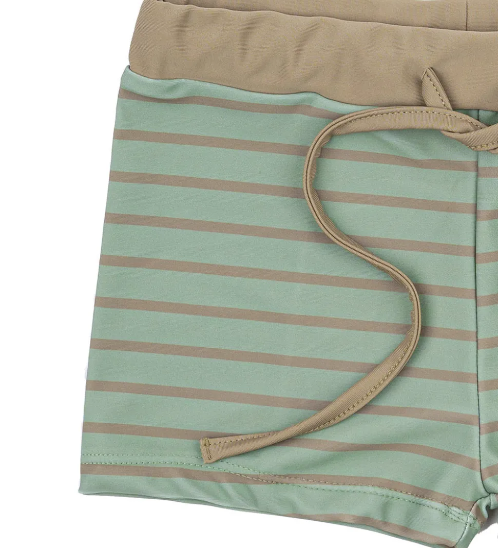Smart Mikk-Line badetøj i en flot grøn med brune striber. Mikk-Line badetøjet har en behagelig pasform med justerbar snøre i taljen, der sikrer god komfort og holdbarhed.