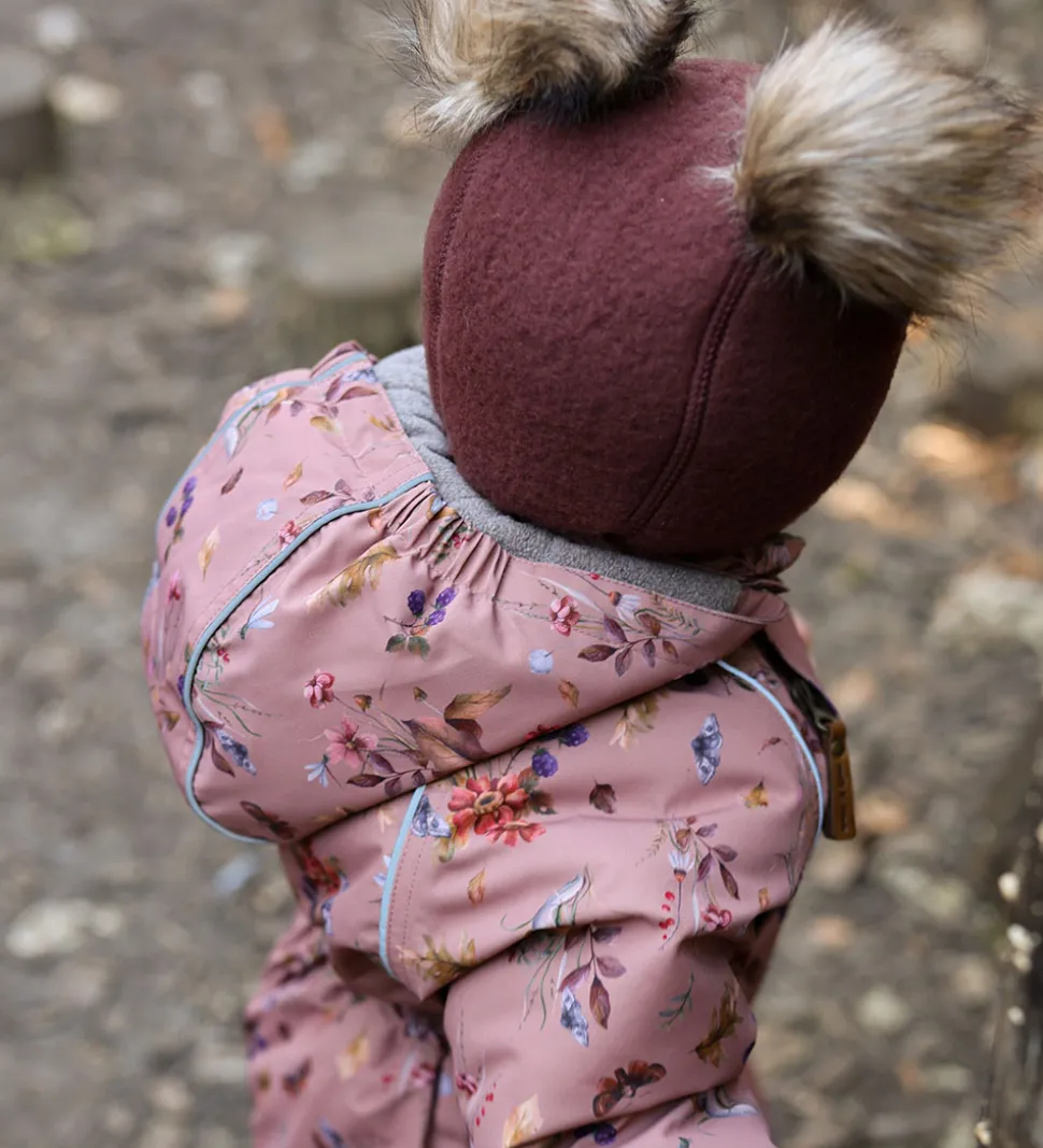 Pæn Mikk-Line elefanthue af filtet merinould i mørkerød. Elefanthuen har nuttede, brune kvaste på toppen, som kan tages af ved hjælp af trykknapper. Under hagen er der et brunt lædermærke med et Mikk-Line-logo.
