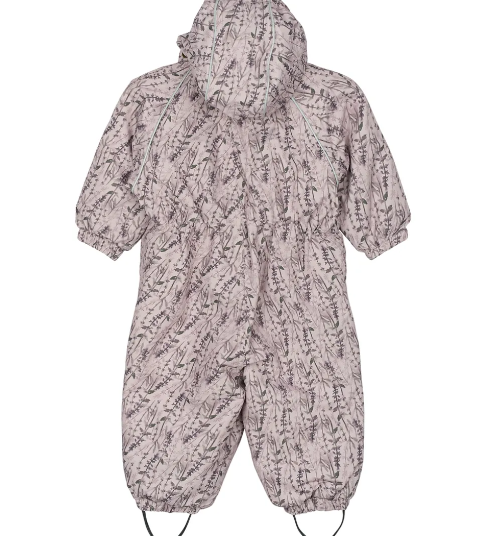 Fin Mikk-Line flyverdragt i støvet rosa med et delikat blomstret mønster. Flyverdragten har refleksdetaljer langs skuldrene, på venstre ærmer og på hætten.