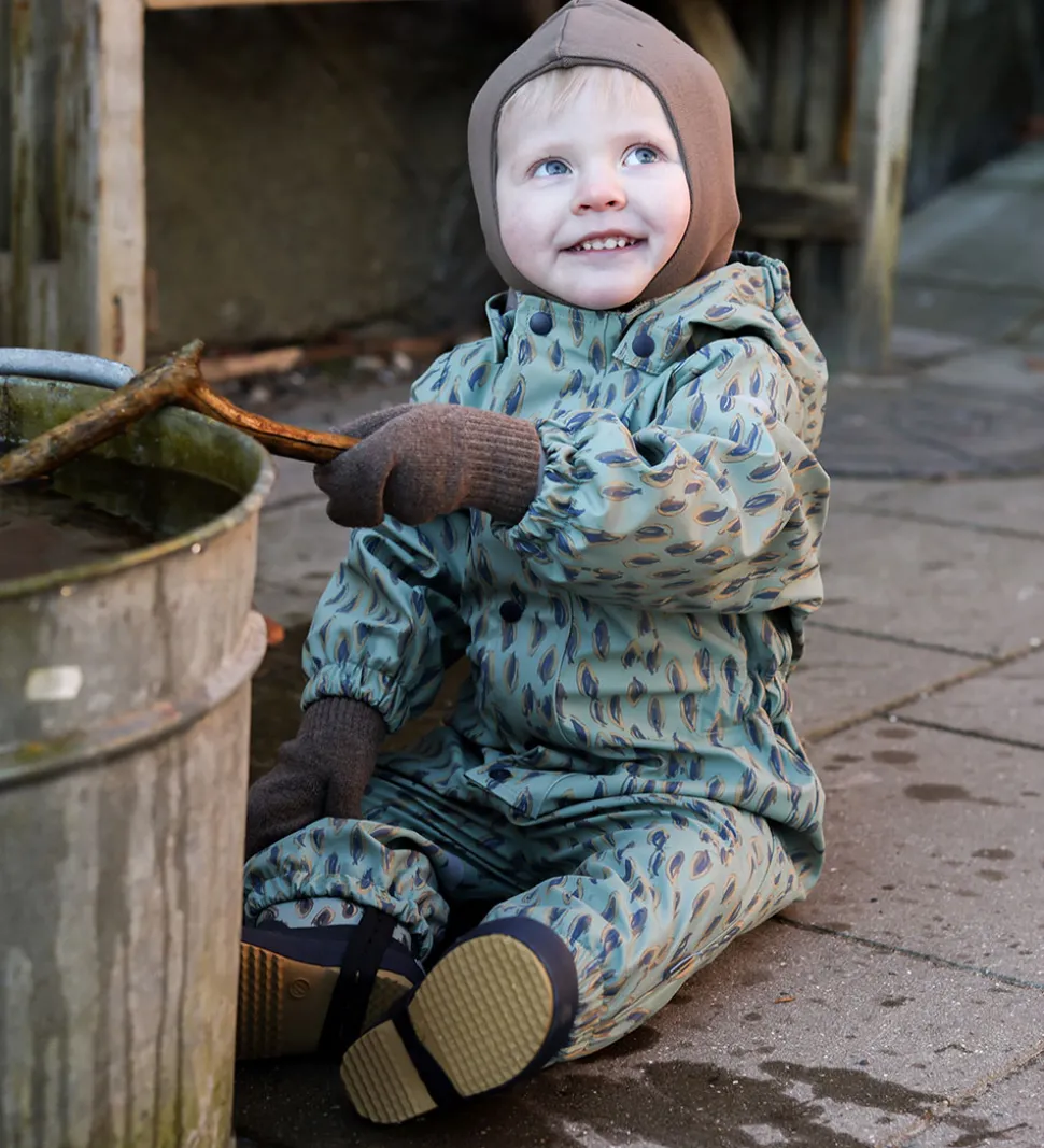 Flot Mikk-Line regndragt i støvet grønt PU med et print i brune nuancer samt blå.